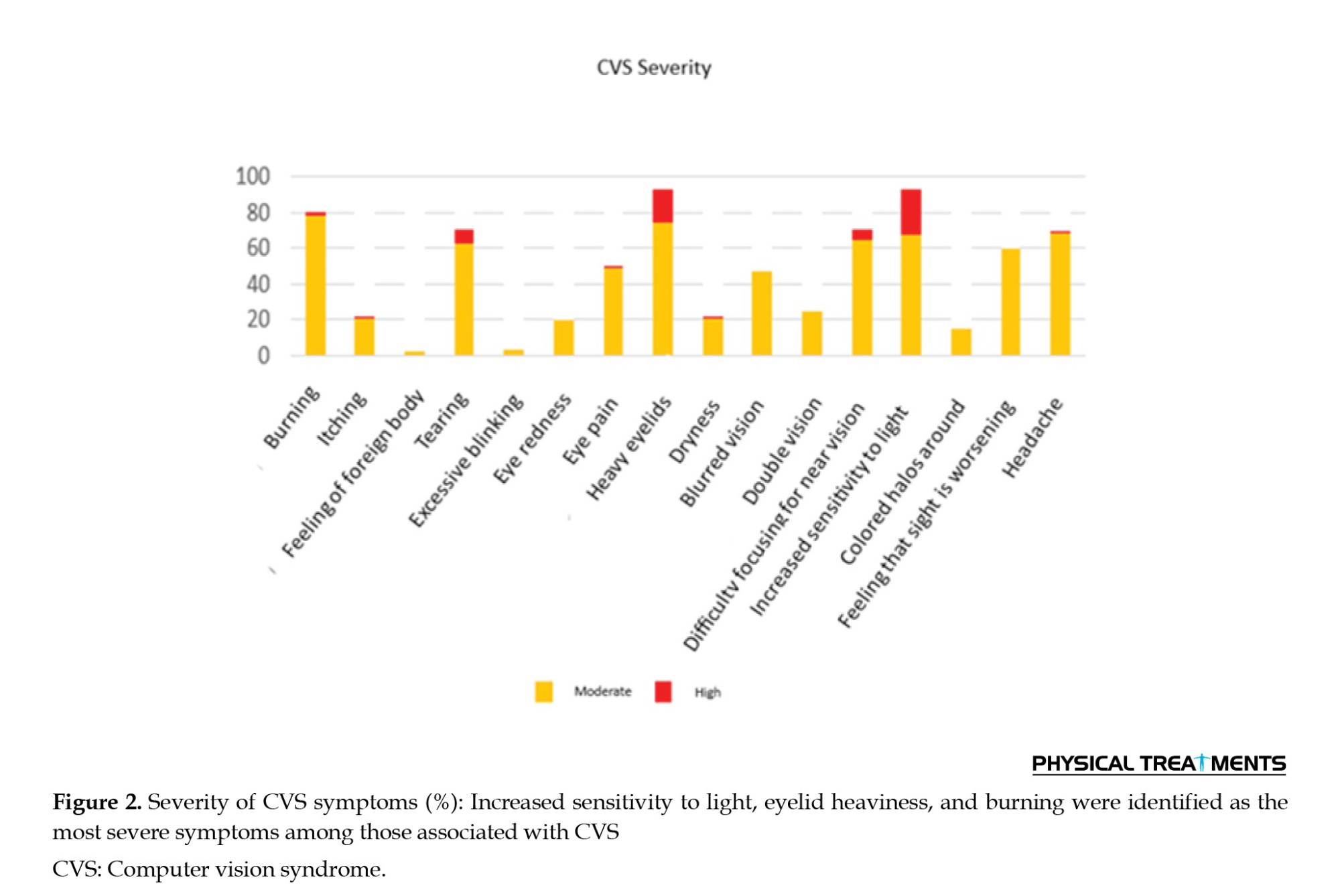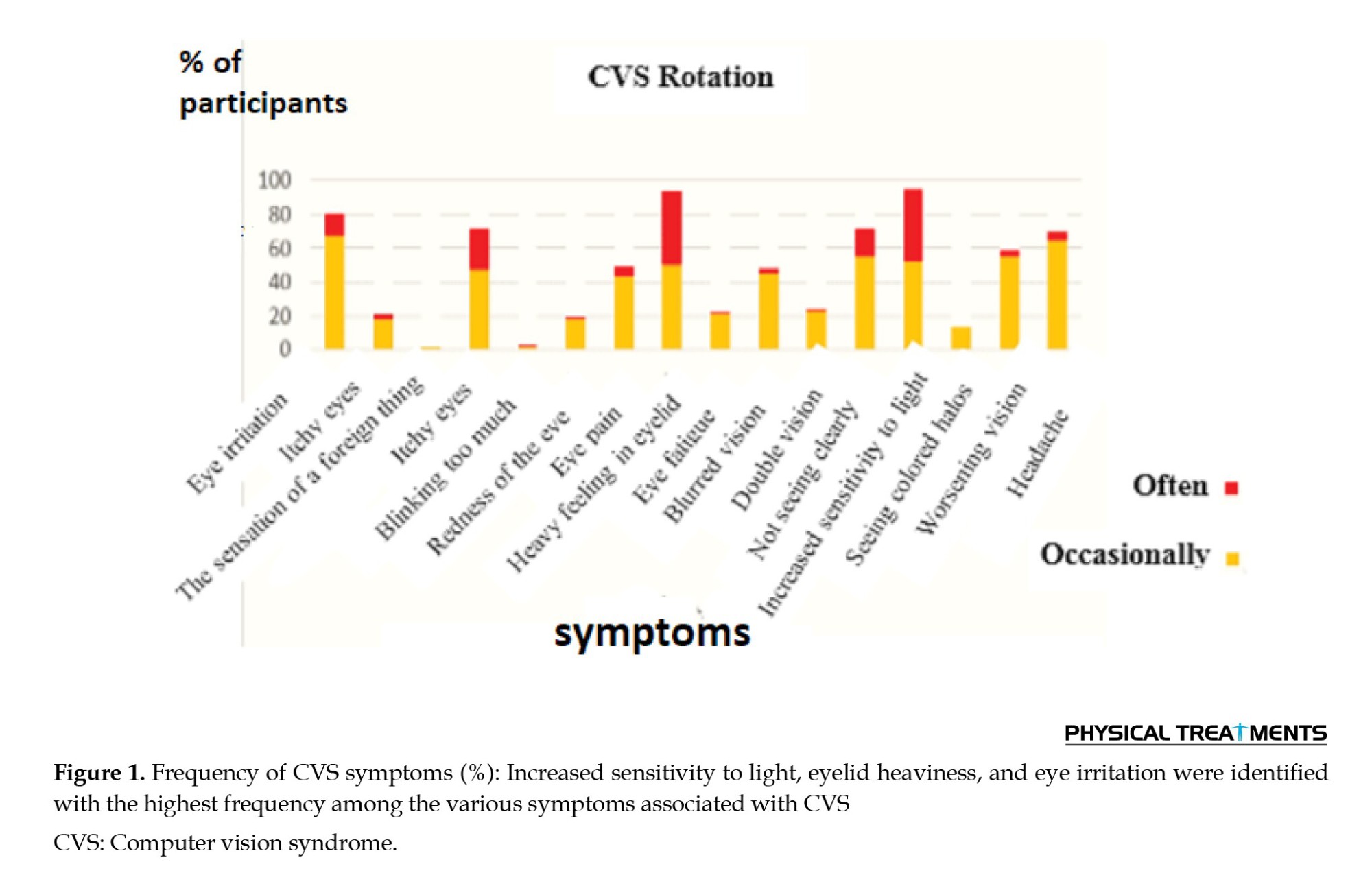 Computer vision syndrome (CVS) is a collection of visual problems associated with activities related to or performed while using computers [9, 10]. The most common symptoms include eye irritation, fatigue, redness, stimulation, tearing, blurred vision, color vision disturbances, headache, and light sensitivity [11, 12]. Approximately 60 million computer users worldwide suffer from CVS, with nearly one million new cases added annually [11]. Many studies have shown a high prevalence of CVS (60-90%) among users of digital displays [13-16]. It also affects the quality of life, including sleep quality (SQ) and stress, and consequently reduces productivity [11]. Adequate sleep duration and quality are crucial components of an individual’s physical and emotional health [17].
