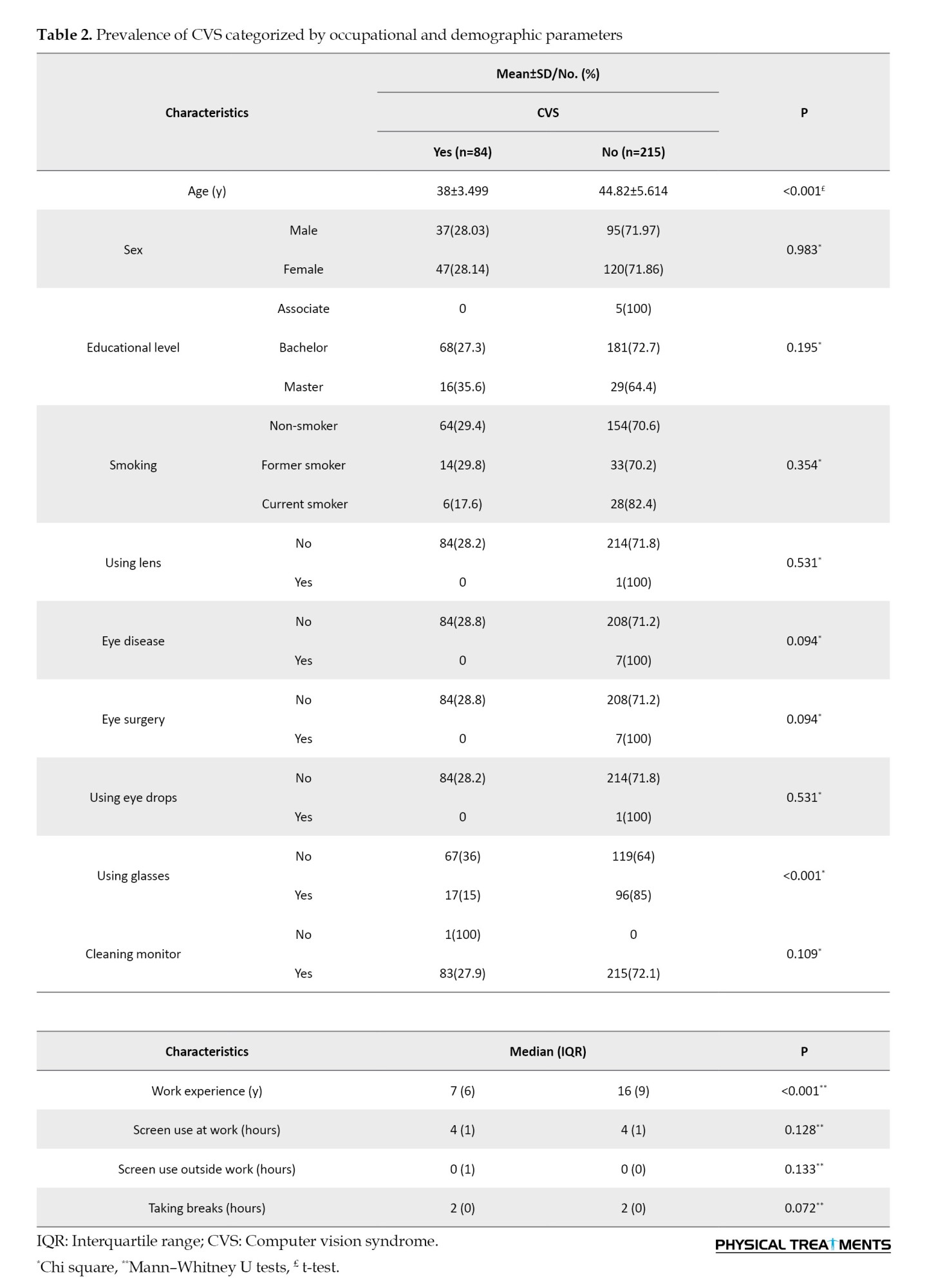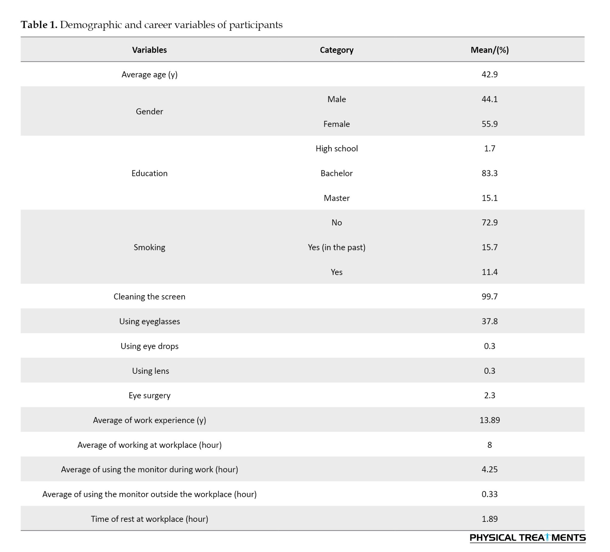 A total of 299 questionnaires were collected from administrative staff at a specific university center in Iran. The mean age of participants was 42.9 years (range: 29-59) with a gender distribution of 44.1% male and 55.9% female. Among the participants, 27.1% reported a history of smoking. Additionally, regular screen cleaning (99.7%) was the most frequently reported visual intervention. Participants spent an average of 4.25 hours per day using a monitor at work, with 2-6 hours dedicated to this activity. Outside of work hours, individuals used a monitor for an average of 0.33 hours, and allocated 1.89 hours for breaks during work (Table 1).