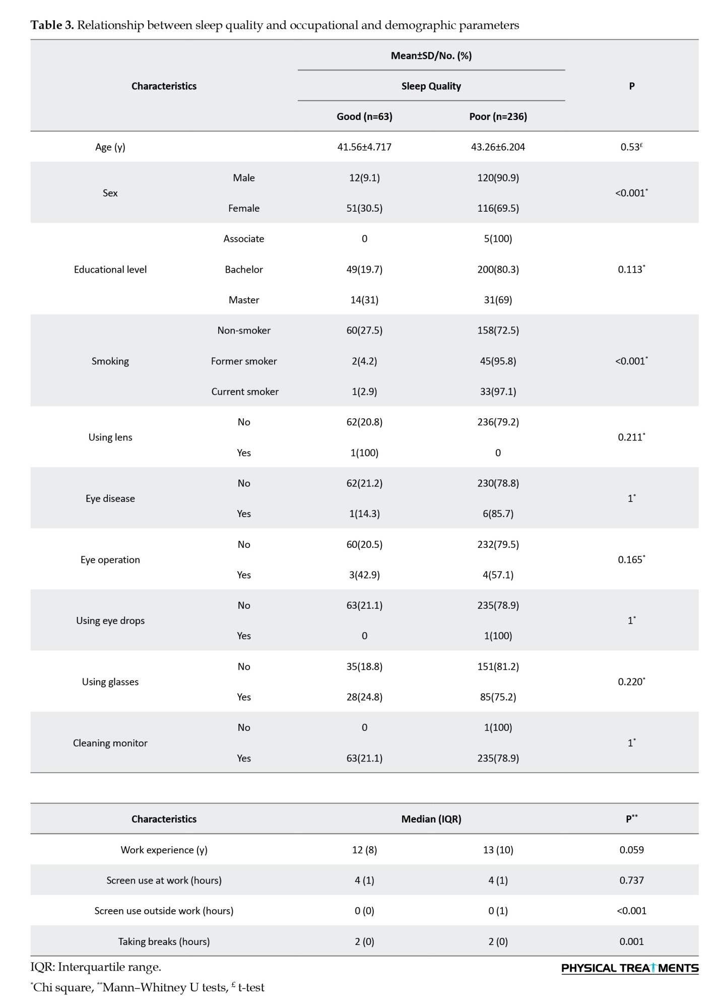 Advancements in modern technologies have led to substantial integration of computer-based operations in the activities of administrative personnel. Despite the undeniable simplification of numerous tasks facilitated by these tools, their users remain consistently exposed to digital screens. This prolonged exposure has the potential to influence the manifestation of CVS-related symptoms and the overall SQ of individuals. Notably, such symptoms tend to occur more frequently in settings where adherence to safety and health principles is comparatively lax. The primary objective of this study was to investigate the correlation between CVS prevalence and SQ among administrative personnel at a university center in Iran, considering the extent of digital device usage.