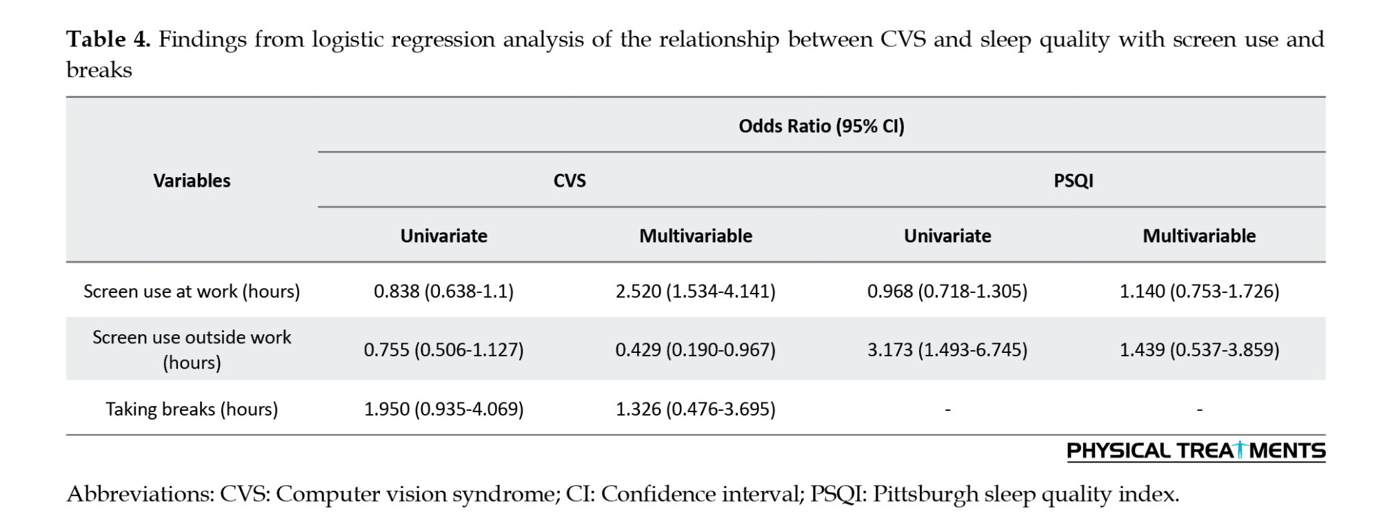 A regression analysis was conducted to assess the relationship between CVS and SQ, including variables, such as monitor use at work and outside of work, and taking breaks. Initially, variables were included in a binary logistic regression model, and those with P<0.2 were advanced to a multivariable logistic regression model. This approach aimed to evaluate the association between monitor use, taking breaks, and CVS and SQ. The results were presented as ORs with 95% CI.