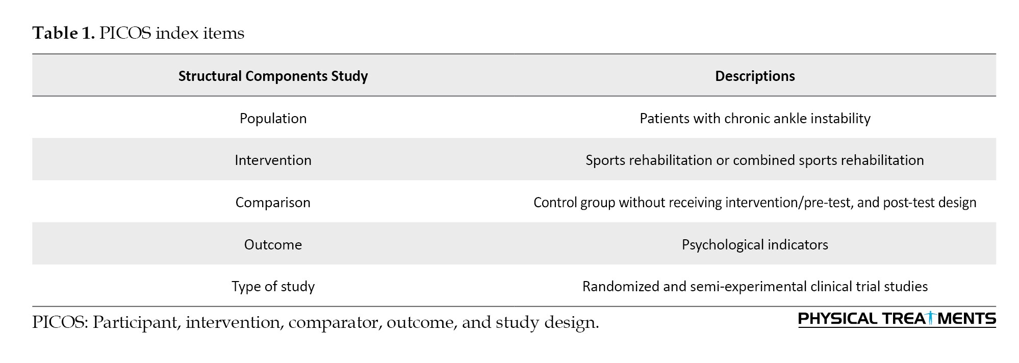 This systematic review was conducted by the guidelines outlined in the preferred reporting items for systematic reviews and meta-analyses (PRISMA) statement. The article search started on June 25, 2023, when two researchers (Masoud Azizian and Behnam Gholami-Borujeni) conducted a two-step research for the desired studies using the online databases of PubMed, SPORTDiscus, CINAHL, and Google Scholar. In the first step, the key terms “chronic ankle instability AND balance training OR neuromuscular training OR proprioceptive training OR rehabilitation OR exercise” were used to search the databases. The key terms “chronic ankle instability AND health-related quality of life OR fear of reinjury OR fear-avoidance beliefs questionnaire OR Tampa scale of kinesiophobia” were applied. A search was also conducted in other databases as well as unpublished articles, but no articles were included in the review through this process. The PICOS framework, considering patient (participant, problem, or population), intervention or exposure, control (comparator), outcome, and study design, was applied to include or exclude the studies [21] (Table 1).