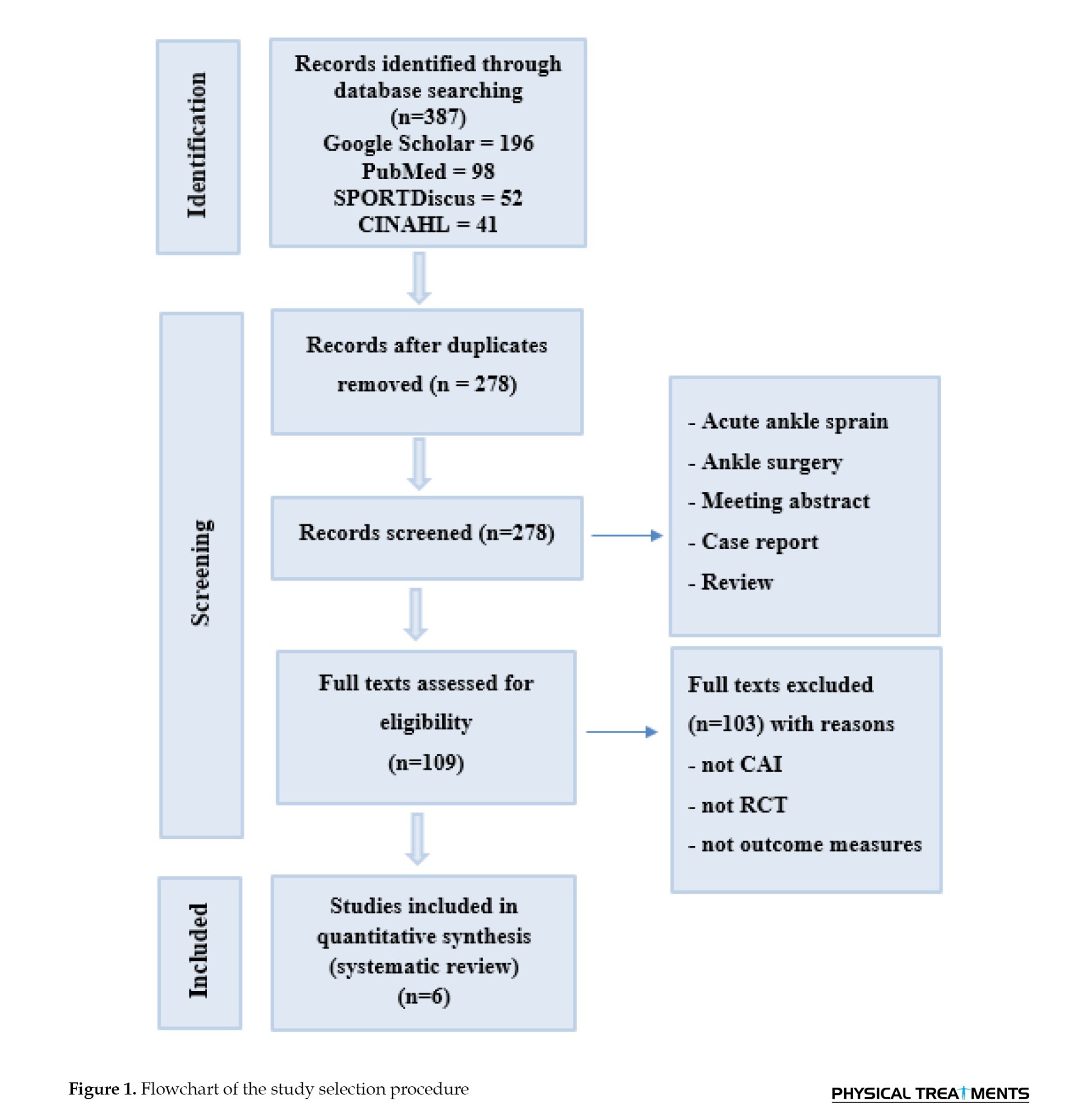 Figure 1 shows the study results. A total of 387 articles were retrieved. Of these, 196, 98, 52, and 41 studies were selected from Google Scholar, PubMed, SPORTDiscus, and CINAHL, respectively. Then, 278 articles were excluded for failing to meet the inclusion criteria. Moreover, 103 studies were removed due to the use of different interventions (Kinesio-taping), populations (acute ankle sprains), case studies, or systematic research designs. Finally, seven studies were selected for review.