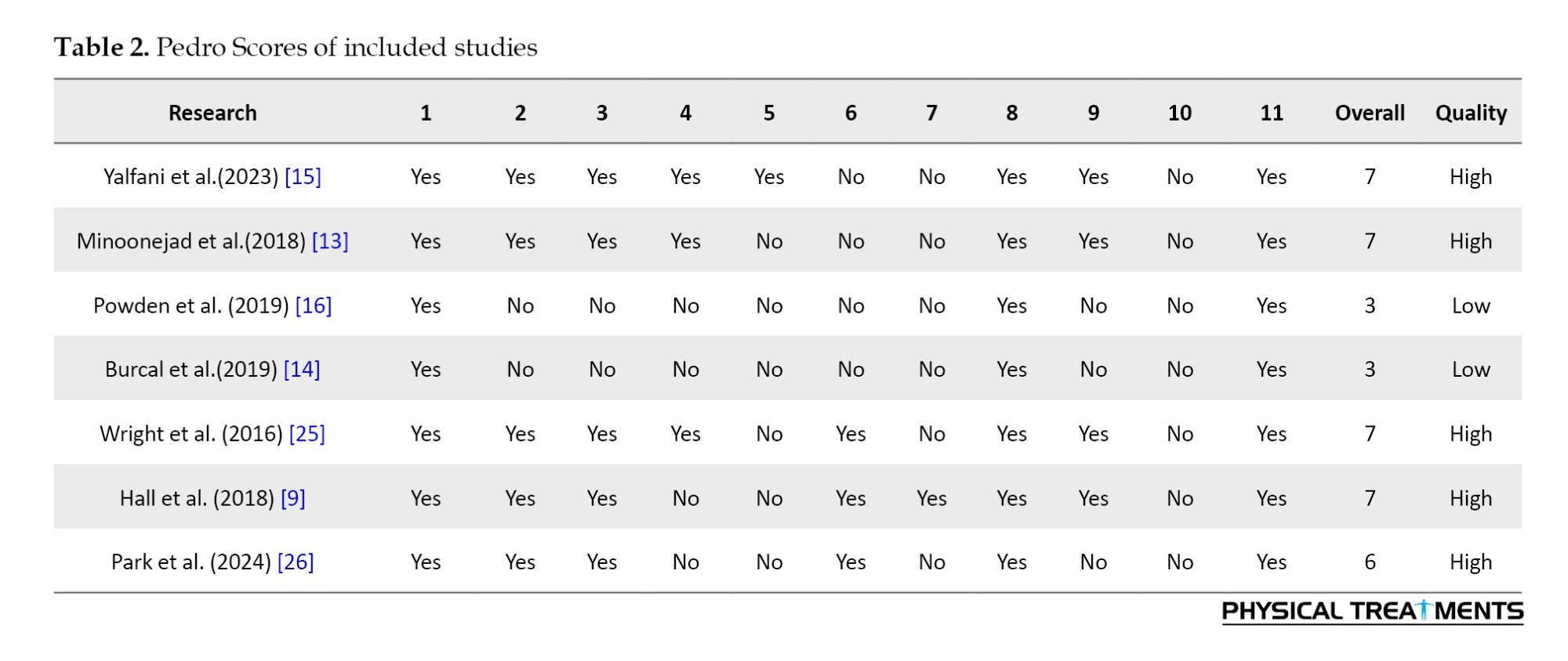 Of these six studies, four and two had high and low quality, respectively, according to the PEDro scale (Table 2).