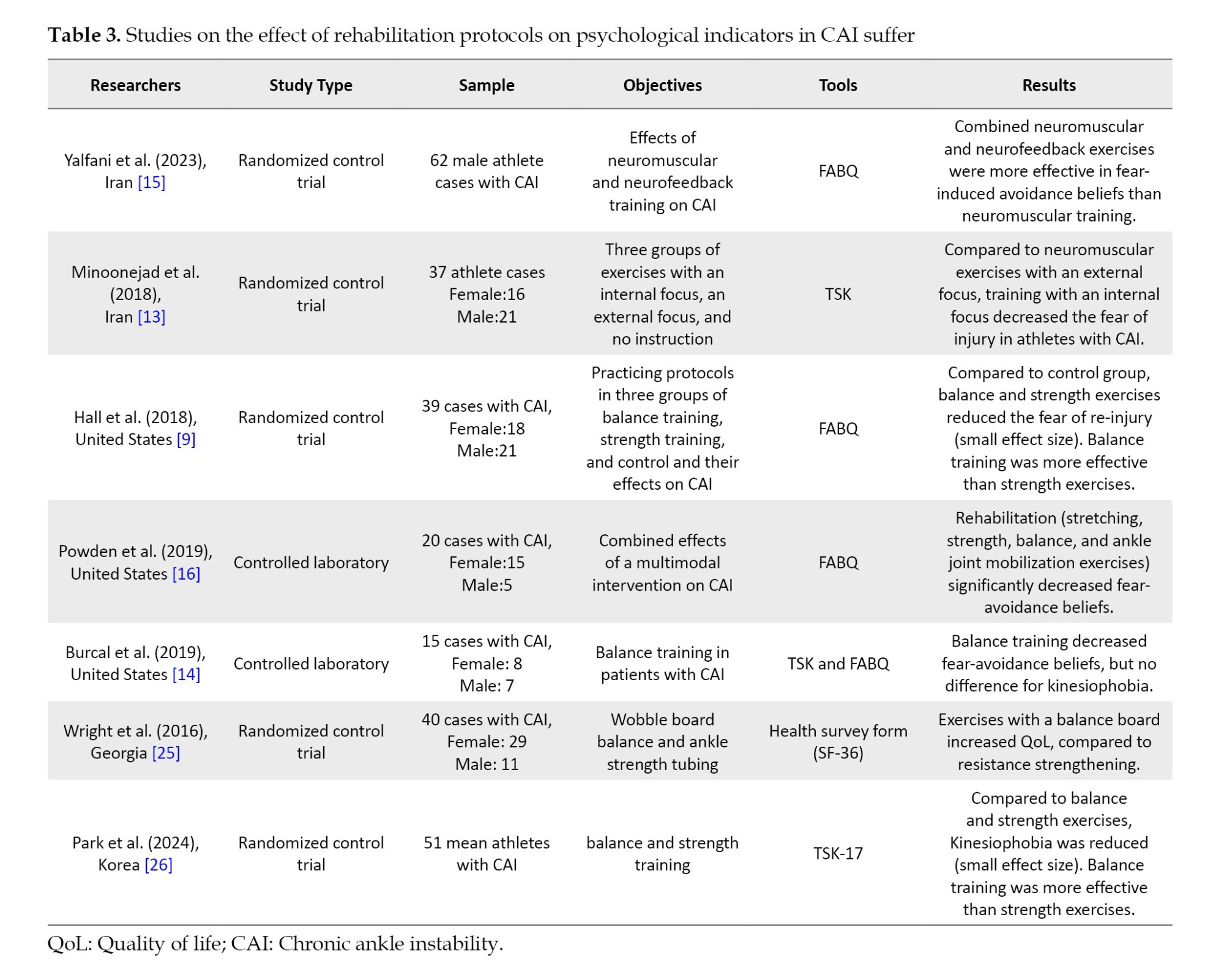 From the seven selected studies, four implemented rehabilitation protocols for four weeks [9, 13, 14, 25], while one study lasted six weeks [16] and another eight weeks [15]. Four studies used conventional (physical-only) rehabilitation protocols [9, 13, 14, 25], while two studies used multimodal rehabilitation protocols to evaluate psychological indicators. The systematic review results of seven selected articles, as described in Table 3, showed that multimodal rehabilitation had better outcomes than conventional rehabilitation protocols for improving QoL, kinesiophobia, and fear-avoidance beliefs in patients with CAI. These variables were crucial psychological indicators for the treatment and rehabilitation of individuals with CAI. Hall et al. compared the effects of balance and strength exercises on fear-avoidance beliefs in people with CAI. A total of 39 people with CAI (21 men and 18 women) with a mean age of 20.9±3.8 years. Their results showed a significant difference between balance and strength exercises in reducing fear-avoidance beliefs with a low effect size (P=0.1, η2=0.27) [9].