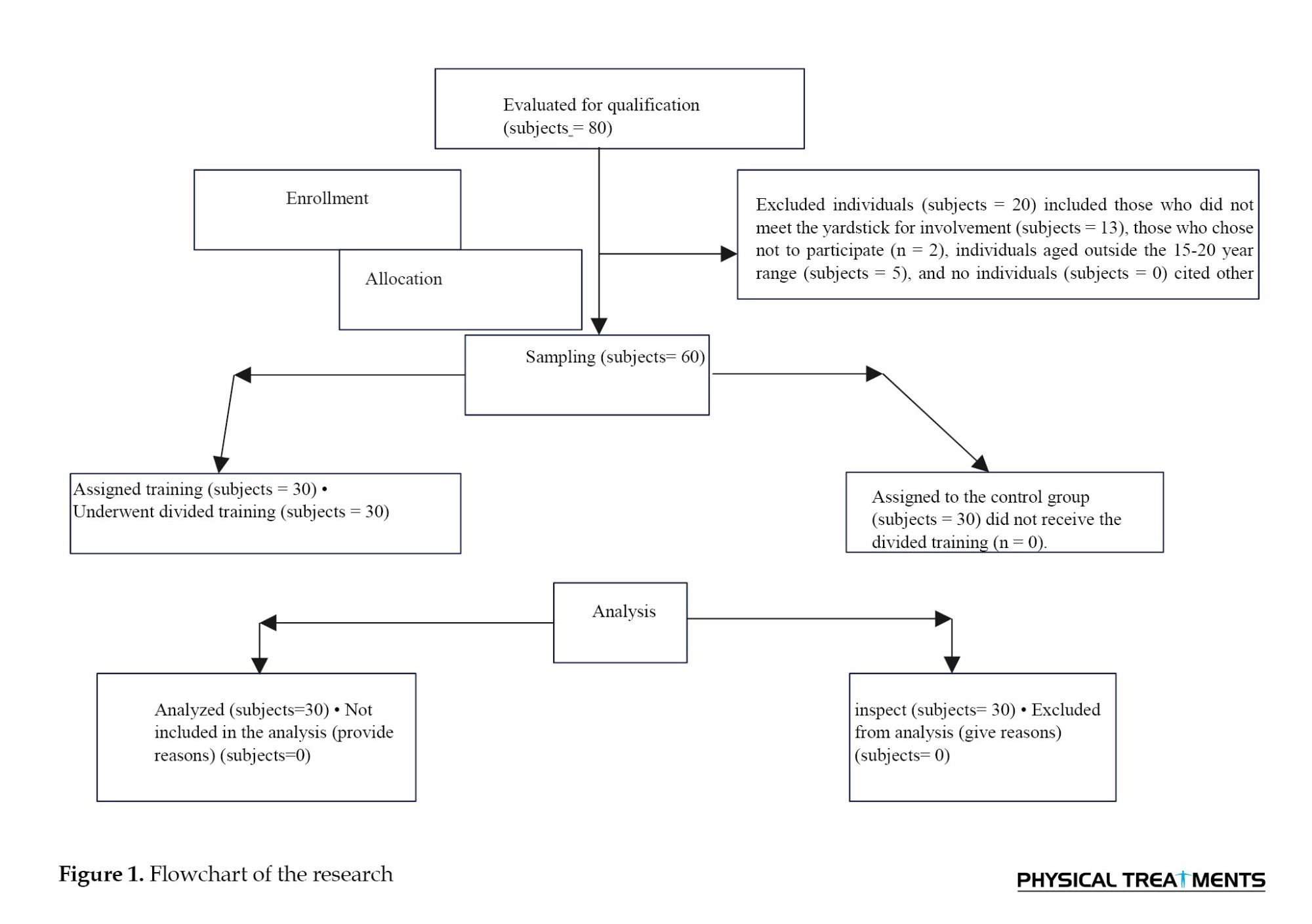A randomized controlled trial (RCT) was conducted, and ethical clearance was obtained from the Ethics Committee of Hormozgan University of Medical Sciences. Initially, 80 participants were recruited from a university physical therapy clinic that serves clients from the surrounding community. The yardstick for involvement is among 15- to 20-year-olds, having a body mass index (BMI) of 20-25 kg/m², a forward shoulder angle (FSA) exceeding 52°, and an FHA greater than 46°, with these angles measured through photogrammetry (Figure 1). Subjects were omitted if they had a chronicle of cervical spine or back surgery, exhibited neurological symptoms, suffered from atrophic arthritis impacting the neck or back, were currently taking muscle relaxants, engaged in regular physical activity each week, or were professional athletes [26], non-completion of the training program according to the research, lack of willingness of participants to continue participating in the research, non-participation of the participants in two consecutive training sessions, injury during the execution of the exercises [27, 28]. Next, applying the yardstick for involvement and elimination, an expert in physical therapy selected 60 participants. The sample size was established based on preliminary analysis utilizing G*Power software, with the FHA score serving as the primary outcome variable. (Figure 1). Assessments were performed at the beginning of the research and again after 8 weeks at the university’s physical therapy clinic. Following the initial assessment, participants were allocated to one of two groups: Group 1 (CE) and Group 2 (Control). Group 1 underwent a supervised intervention for 8 weeks, while the control group carried out their daily activities. Randomization was implemented using a computerized random number generator. The allocation sequence was kept hidden from the researcher responsible for enrolling and evaluating participants using sequentially numbered, opaque, sealed envelopes. Participants were partially blinded, as they did not know the expected diversity among the groups, but were aware of the treatment they were receiving.