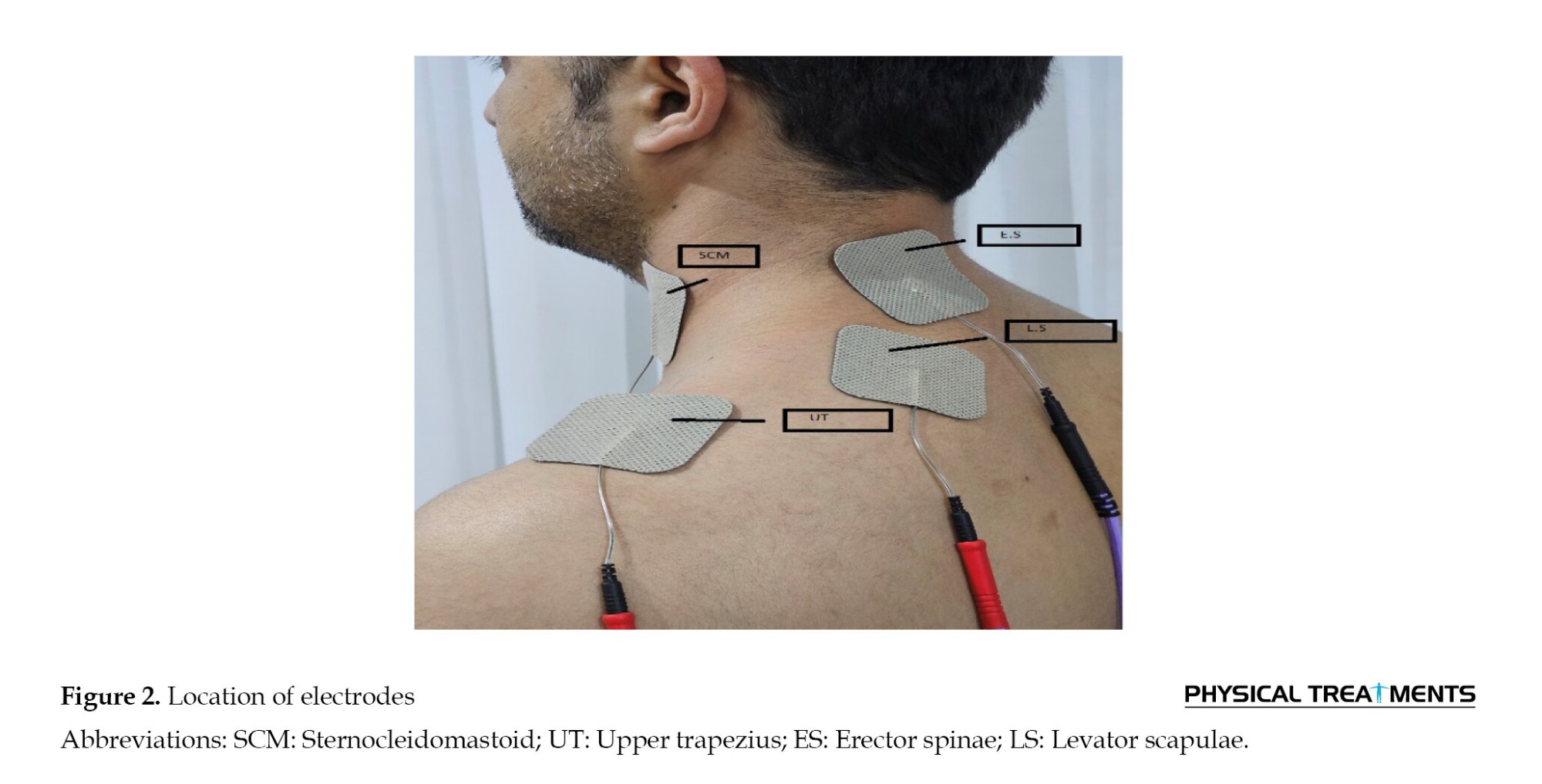 After shaving and polishing the skin at the electrode sites, surface EMG signals were captured from four muscles using a Bagnoli-16 system (FREE EMG 300, BTS Bioengineering, Italy) with a sampling rate of 1000 Hz and a bandwidth of 20–450 Hz. Four pairs of active single-differential dry surface electrodes were evenly positioned on the sternocleidomastoid (SCM), upper trapezius (UT), ES, and levator scapulae (LS) muscles, in line with the established placement protocols (Figure 2). For the UT muscle, the electrode is positioned bilaterally between the spinous process of the C7 spine and the acromion [31]. The SCM electrodes are placed near a point that is thirty percent of the distance from the sternal notch to the mastoid process, straight over the muscle belly of the sternal head [32]. The electrodes for the ES are located 2 cm lateral to the spinous processes of C4 and C5 [32]. In contrast, the electrodes for the LS are positioned betwixt the anterior border of the UT and the posterior border of the SCM [31].