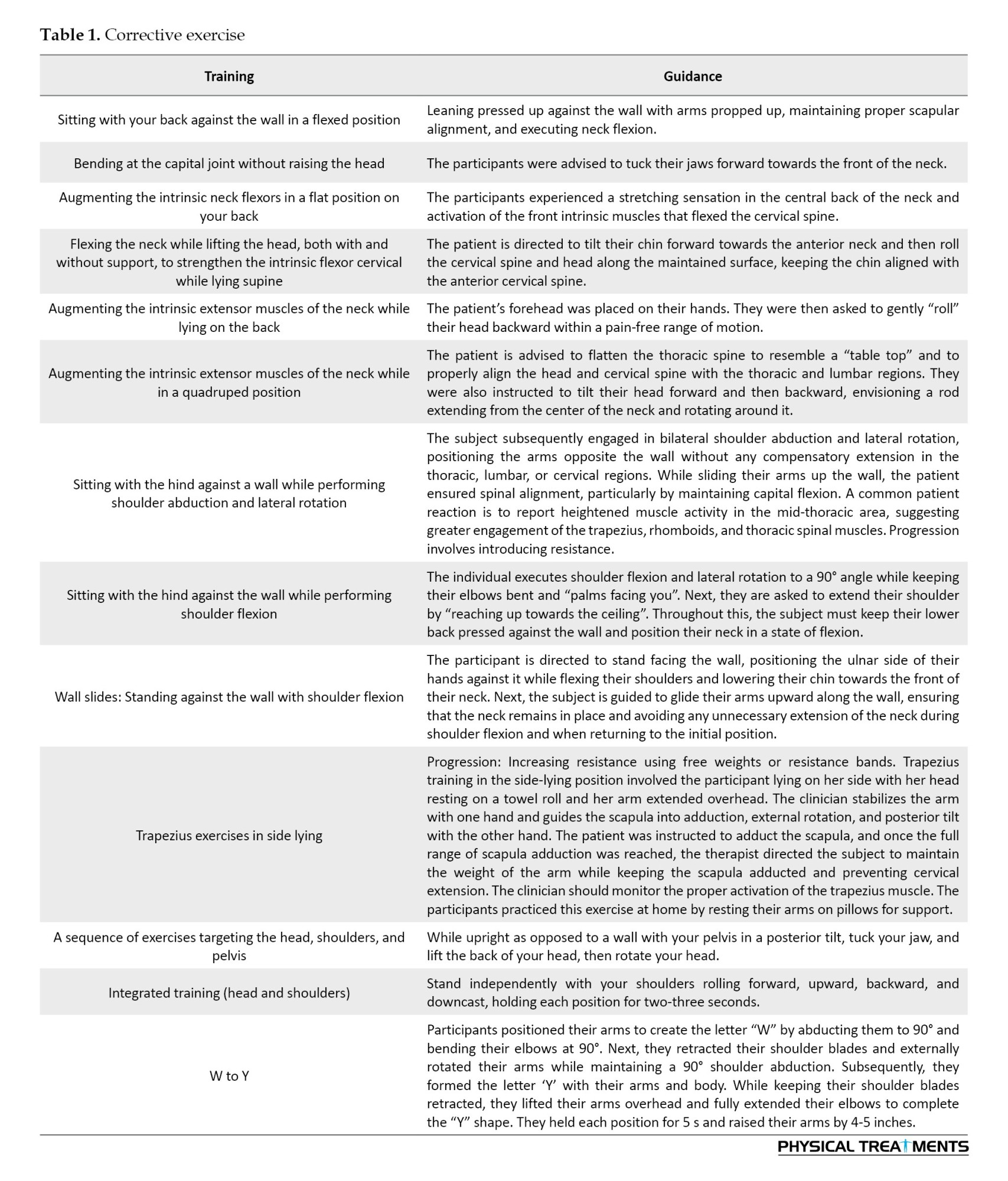 The intervention consisted of three distinct phases. Every initial phase focused on performing slow and controlled training that caused little discomfort, aimed at enhancing muscle coordination and proprioception. The secondary period prioritizes building muscular endurance. The final stage concentrated on muscle reinforcement [33]. Each training session was performed for a duration of 30-60 s [16]. During the second stage, the participants were required to complete three sets of 15 reiterations, with the initial 12 reiterations performed at maximum force, allowing for a 1-minute rest between sets. In the third phase, the participants were encouraged to perform as many reiterations as possible, targeting three sets of 15 reiterations. The control group received advice on how to correct posture. This advice included the following: 1) Reduce neck extension and forward movement of the neck while performing daily tasks. 2) While sitting at the computer, have a supportive chair that will decrease thoracic flexion and help conserve good thoracic posture [16]: 3) Support your forearms either on the desk or an extended tray for a keyboard. The desk or tray should be at the appropriate height, so you do not need to “slouch” for your arms to be supported; 4) Alignment correction when wearing glasses should follow the same sequence that has been demonstrated in the sitting back-to-wall exercises: Start with correction of lumbar, thoracic, and scapular alignment, and then neck and head position; 5) During daily activities, amend your alignment and decrease the stress imposed by adjacent joints before initiating cervical movements [16], and particularly correct the position of your thoracic vertebrae and shoulder girdle, and support your upper limbs; 6) Apply your abdominals to maintain normal lumbar spine alignment and prevent thoracic flexion or “slumping”, particularly when sitting [16].