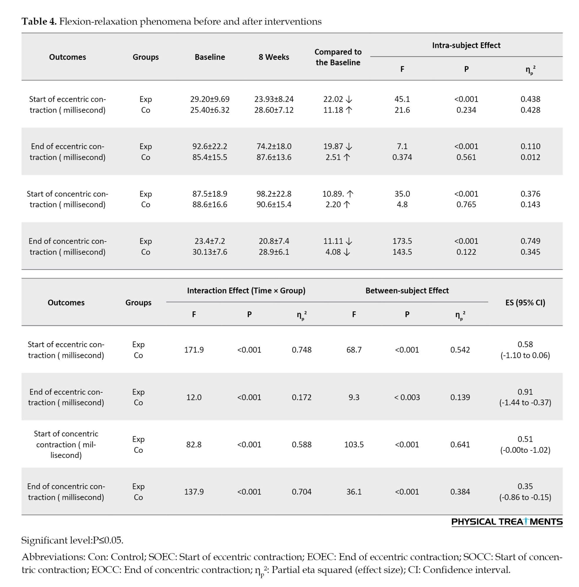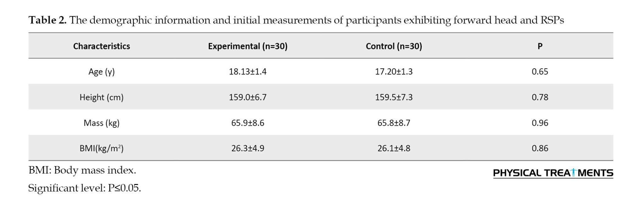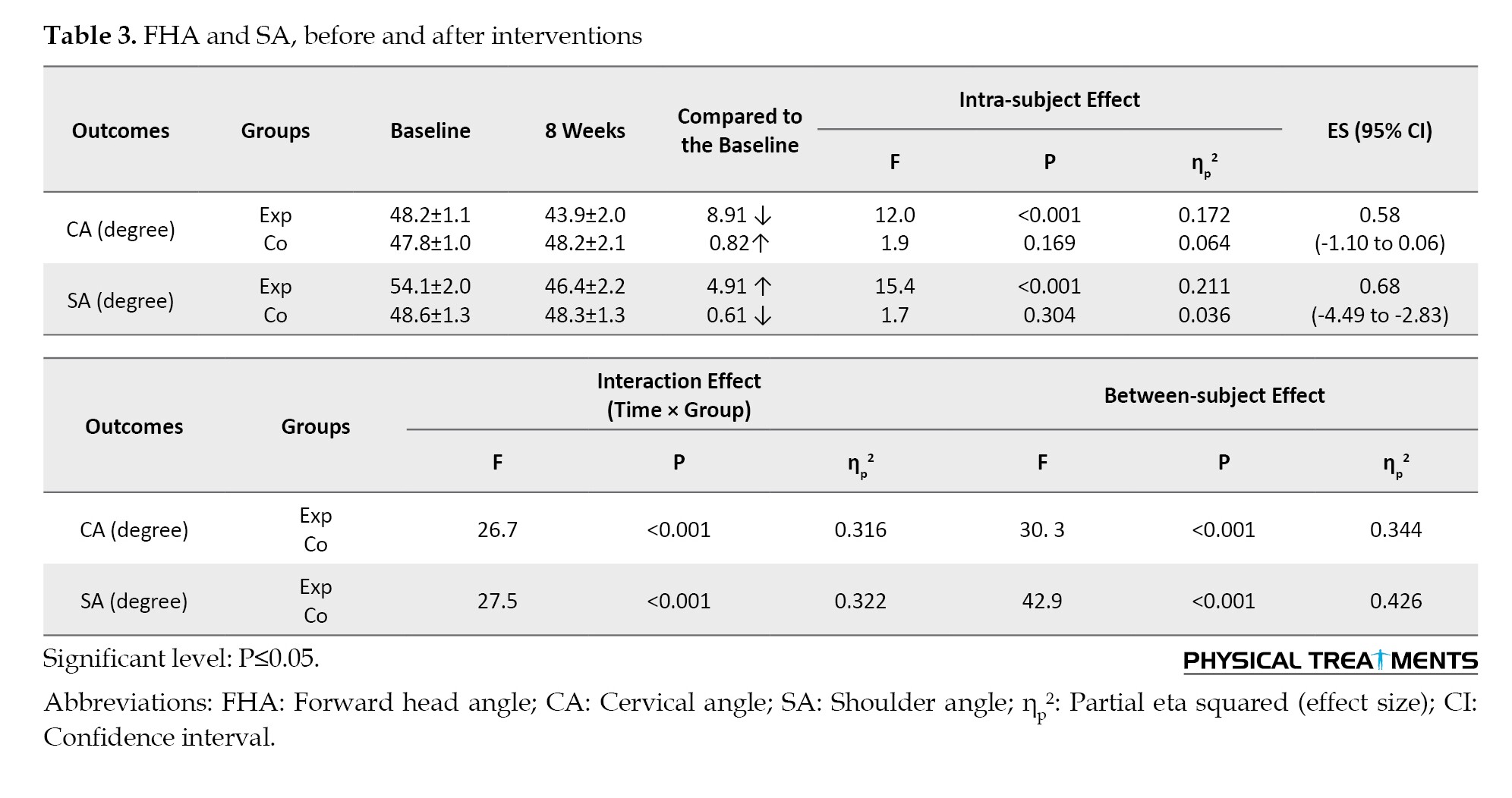 The outcome of the existing research on the FSA of the participants indicates that the training period had a positive effect. The findings of the present study regarding the FHP and RSP correction of the participants indicate that the training period had a positive effect. The findings of the current study are consistent with those of Abdollahi et al. [46]. Idan Almasoodi et al. [47], and Letafatkar et al. [16], with no discrepancies noted.