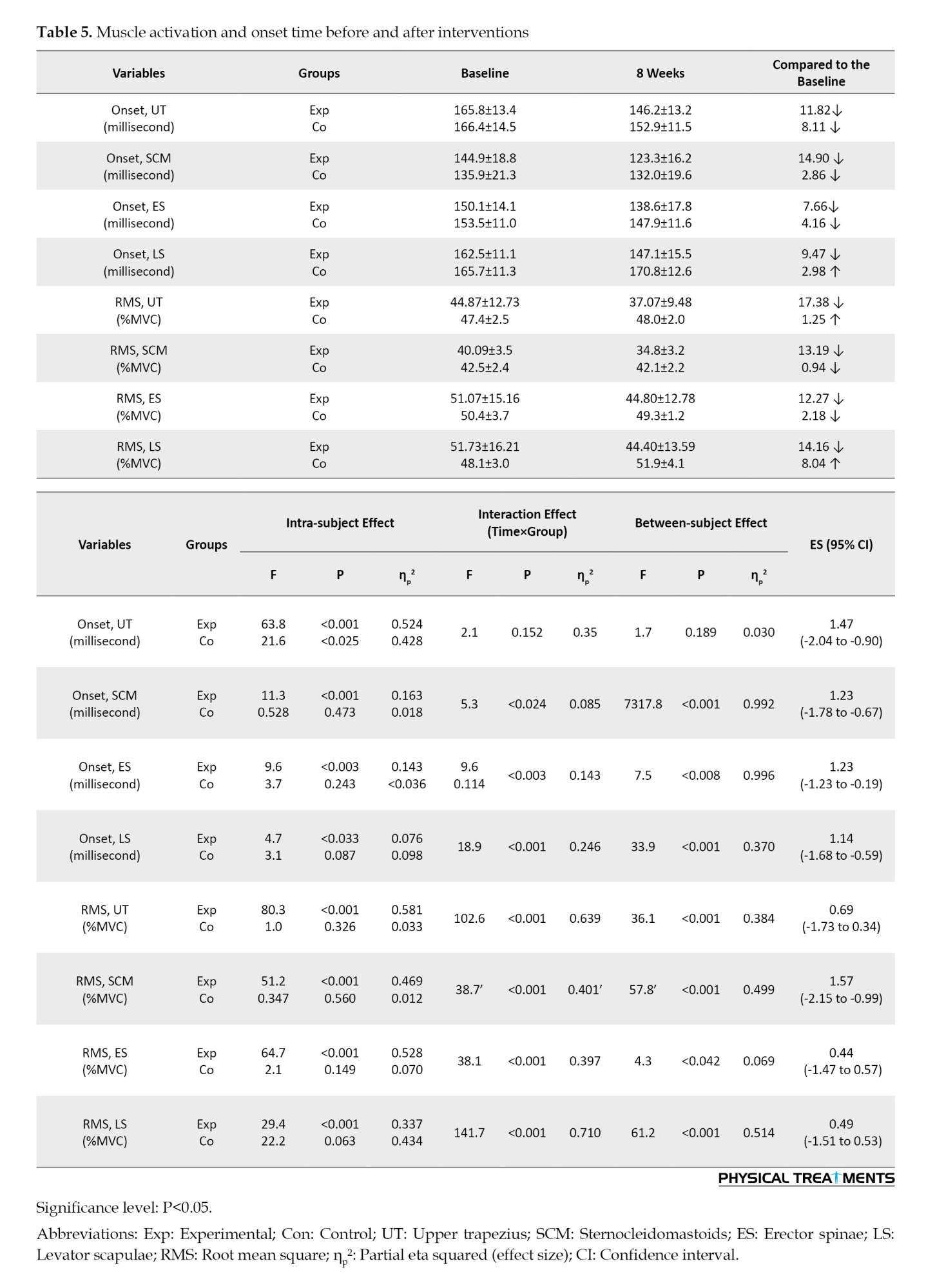 One reason for the discrepancies between the results of this study and those of Neblett et al. [38] is that the exercises performed in their study differed from those in our research. Additionally, in the study above, the participants experienced back pain, whereas in our study, the individuals had FHP and forward shoulder posture (FSP). Furthermore, the methods used to measure muscle activity differed between studies.