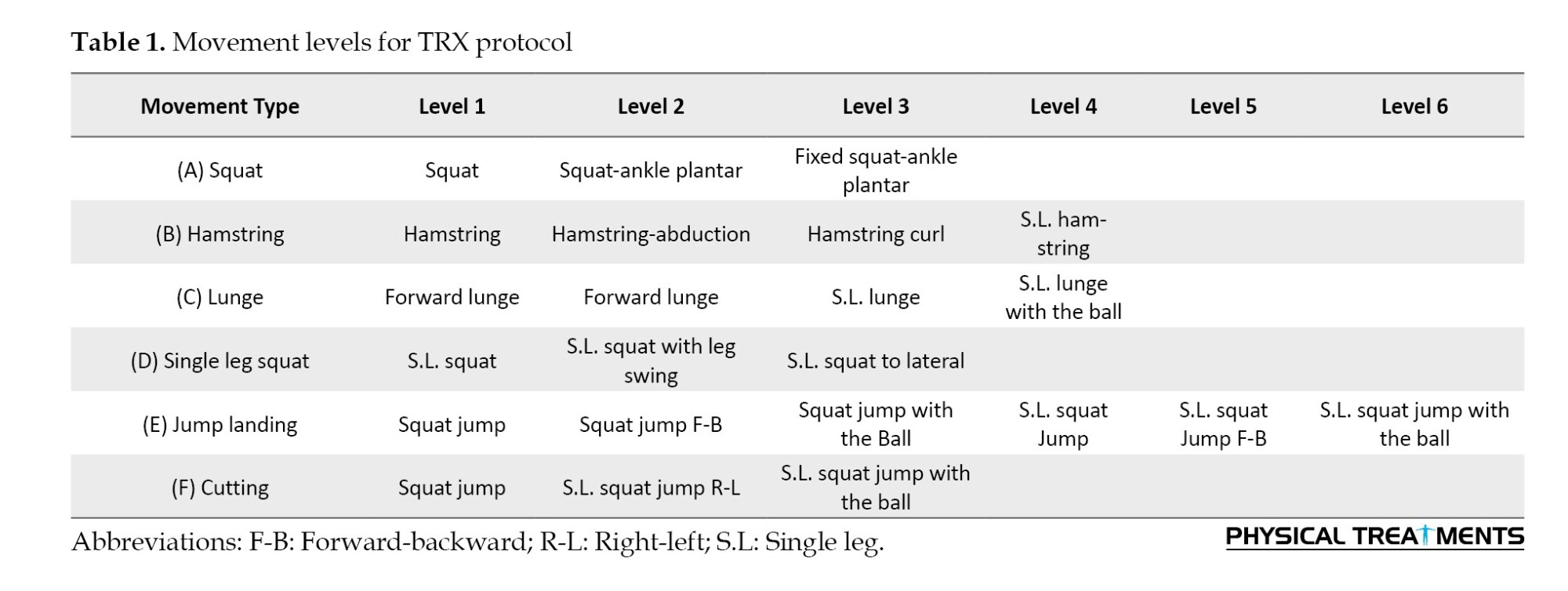 After completing the pre-test assessments, participants in the experimental groups undertook a structured TRX training program, conducted three times per week over a six-week period on non-consecutive days. To maintain consistency, all training sessions were scheduled at the same time each day. Each session consisted of a standardized 10-minute warm-up, followed by 15–20 minutes of TRX suspension exercises, and concluded with a 5-minute cool-down routine. To ensure proper execution and minimize injury risk, participants completed two familiarization sessions prior to the intervention. The TRX exercise protocol was developed based on established guidelines and peer-reviewed literature on suspension training [26-29]. Exercises targeted major muscle groups and incorporated movements across multiple anatomical planes to simulate functional and sport-specific demands. The training sessions were conducted using the TRX PRO3 suspension trainer system (fitness anywhere LLC, USA), with the equipment securely mounted on a rod 2.5 meters above the ground. Progression in exercise intensity followed the principles of the FITT model (frequency, intensity, time, and type), advancing through five to six difficulty levels. These levels ranged from beginner (levels 1–2) to advanced (levels 5–6), with difficulty adjusted by modifying suspension angles, exercise duration, and dynamic complexity. The progression protocol was carefully designed to ensure a gradual increase in challenge and was validated by a specialist physician [29] (Tables 1 and 2).