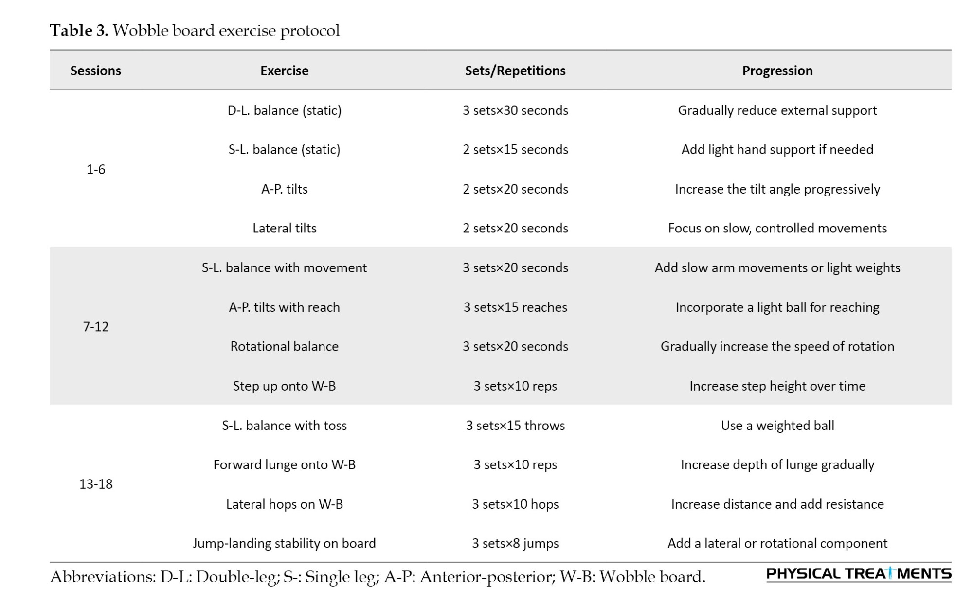 The wobble board exercise intervention was conducted over six weeks, with participants completing three sessions per week on non-consecutive days. Each session lasted approximately 30 minutes, starting with a 10-minute warm-up, followed by the main training segment, and concluding with a 5-minute cool-down to promote recovery. To ensure familiarity with the exercises and proper execution, participants underwent two supervised familiarization sessions prior to the intervention. The exercise protocol was adapted from the established methodology of Clark and Burden [12], which has been widely applied in research on functional ankle instability rehabilitation. The protocol focused on progressively challenging static and dynamic balance through controlled movements performed on an unstable surface. The intervention utilized a wobble board with an adjustable tilt angle to tailor difficulty levels as participants advanced through the program. The core training segment (15–20 minutes) involved exercises targeting proprioception, postural control, and neuromuscular adaptation. These exercises included bilateral and unilateral stance tasks, dynamic weight shifts, controlled rotations, and reaching tasks while maintaining stability. Progression followed the principles of the FITT model (frequency, intensity, time, and type), ensuring a gradual increase in challenge by modifying the tilt angle, duration, and complexity of the tasks. For instance, early stages (weeks 1–2) consist of static exercises with a low tilt angle to develop foundational stability, intermediate stages (weeks 3–4) consist of dynamic exercises with an increased tilt angle to challenge dynamic postural control, and advanced stages (weeks 5–6) consist of functional and sport-specific tasks performed with a high tilt angle to simulate real-world balance demands. All sessions were conducted under the supervision of a trained researcher to ensure adherence to proper technique and progression (Table 3).