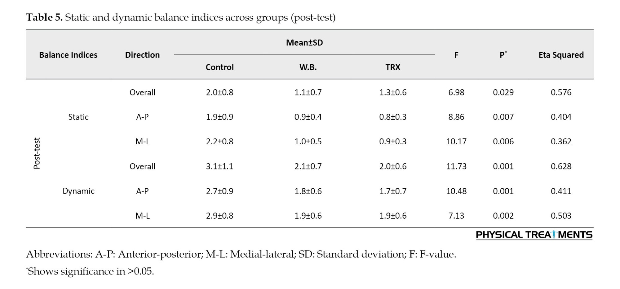 The pre-test balance indices, including static and dynamic measures, revealed no significant differences across the three groups in all directions (anterior-posterior, medial-lateral, and overall; P≥0.05). This confirms comparable baseline balance abilities among the groups before the intervention.