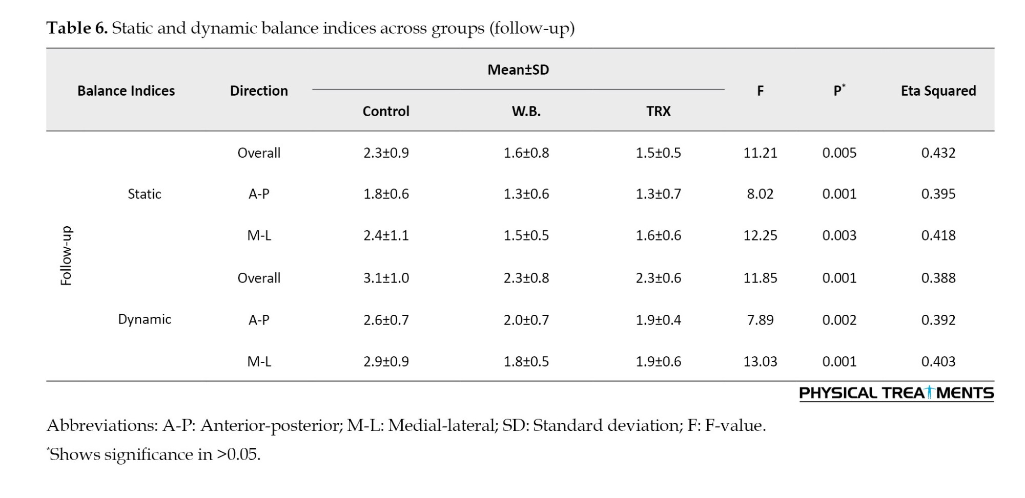 The Bonferroni post-hoc tests indicated that both wobble board and TRX training significantly outperformed the control group in improving balance indices in all directions during the post-test and follow-up stages (P≤0.05). However, no significant differences were found between the wobble board and TRX groups, suggesting comparable effectiveness of both interventions. The observed effect sizes (eta squared) for balance improvements in the wobble board and TRX groups were moderate to large, reflecting substantial benefits from both interventions. Improvements persisted during the follow-up stage, indicating the retention of training effects six weeks after the post-test stage (Table 6).
