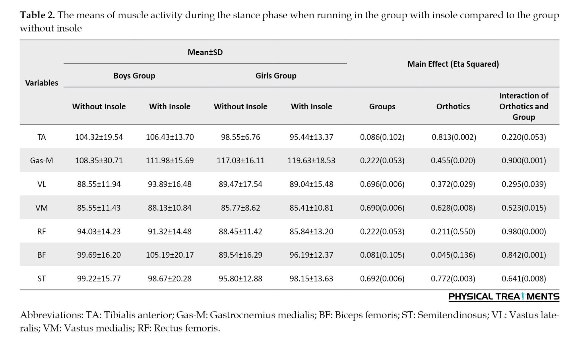 The results of the present study showed that using double-density insoles caused a decrease in the frequency of BF muscle activity during the stance phase in volleyball players. In a study on the nervous system, Ismailia found that maintaining the timing of joint movements involves adjusting the timing of muscle activity. Specifically, showed that in the absorption phase of running, following fatigue, the activity of the BF muscle decreases [6], which is consistent with the results of the present study. Regarding ACL rupture, excessive mechanical loading of the knee, combined with a rapid decrease in acceleration and a sudden change in direction while running, are risk factors [31]. One way to reduce the risk of ACL injury in high-risk cutting and running movements is to strengthen the muscles surrounding the knee, especially the hamstrings [32]. Double-density insoles can prevent ACL rupture by changing the frequency of the hamstring muscles in both femoral heads and the hamstring. Two-density insoles can also help prevent ACL injuries through pressure distribution mechanisms, arch support, impact absorption, and by improving stability and adjusting foot position. Andres . noted that running is associated with individual patterns that create a high activity pattern in the hamstring muscle, similar to speed, in their study on the activity of a specific muscle area at different speeds during running [33]. By reducing the frequency values of the BF during running, double-density insoles can help prevent acute running injuries in the BF [17]. The movements of running and lateral sliding in volleyball, which occur together with sitting and squatting movements during the performance of skills, can cause an imbalance of forces in both static and dynamic movements at the knee joint.