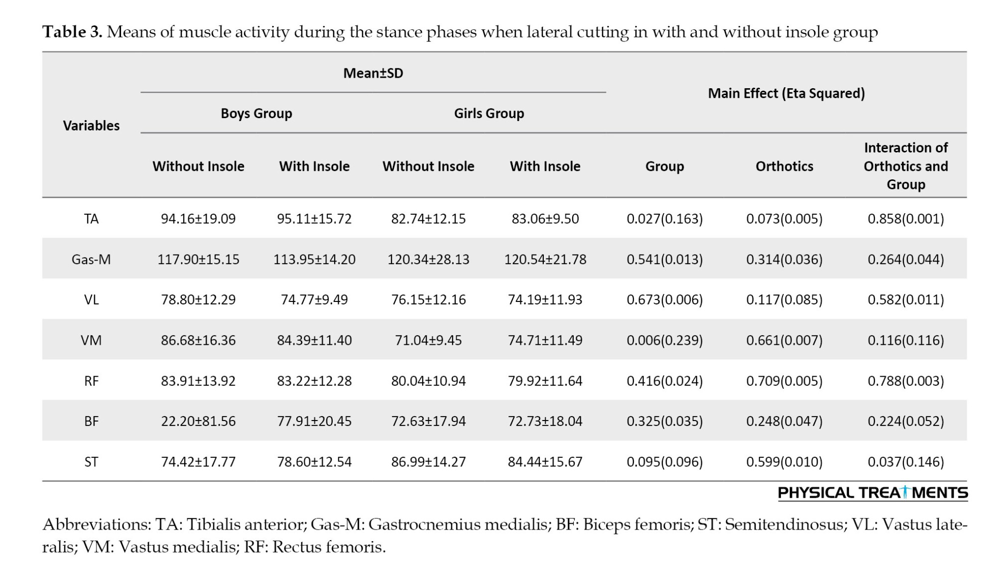 This study investigated the effect of double-density insoles on the activity frequency of selected lower limb muscles during running and lateral sliding in volleyball players. The pattern of muscle activity can be assessed by the intensity of contraction, maximum contraction, and time taken to reach maximum contraction [24]. The results of the present study showed that the use of double-density insoles causes a significant difference in the frequency of certain muscle activities during running and lateral cutting. The results showed that the use of double-density insoles in sliding movements caused a decrease in the frequency of the ST muscle in volleyball players. In volleyball, the repetitive actions of hitting, running, jumping, and landing place significant stress on the knees, leading to the weakening of the internal hamstring muscles (ST and semimembranosus). Over time, this can result in the development of crossed knee abnormalities, which can be corrected through appropriate exercise [25, 26]. Double-density insoles can be useful in reducing the stress on the ST muscle during lateral cutting movements, thereby preventing knock-knee syndrome in volleyball players. An increase in the activity ratio of the internal and external parts of the quadriceps and hamstring muscles, as well as an increase in the activity ratio of the internal compartment to the external compartment of the knee, indicates an increase in the activity of the muscles in the internal compartment of the knee which is considered a positive factor in stabilizing the knee and preventing anterior cruciate ligament (ACL) damage during cutting maneuvers in sports [27]. Creating knee valgus during knee flexion is inevitable; therefore, proper contraction in the internal compartment (semi tendon and VM) is considered a basic requirement to prevent dangerous movement [28]. The findings of this study align with those reported by Sedighi and Anbarian, which indicate that the semi-hard sole significantly reduces the activity of the ST muscle in running [29]. Athletic trainers are advised to use double-density insoles (with enhanced internal stiffness) to improve the running mechanics of their athletes, as these insoles can help reduce injury rates [30]. According to the contractions that occur in the lateral cutting maneuver stage in volleyball players. These contractions involve the ST muscle. The double-density insole has been able to reduce the forces and tension in this muscle by affecting the frequency values of the ST muscle.