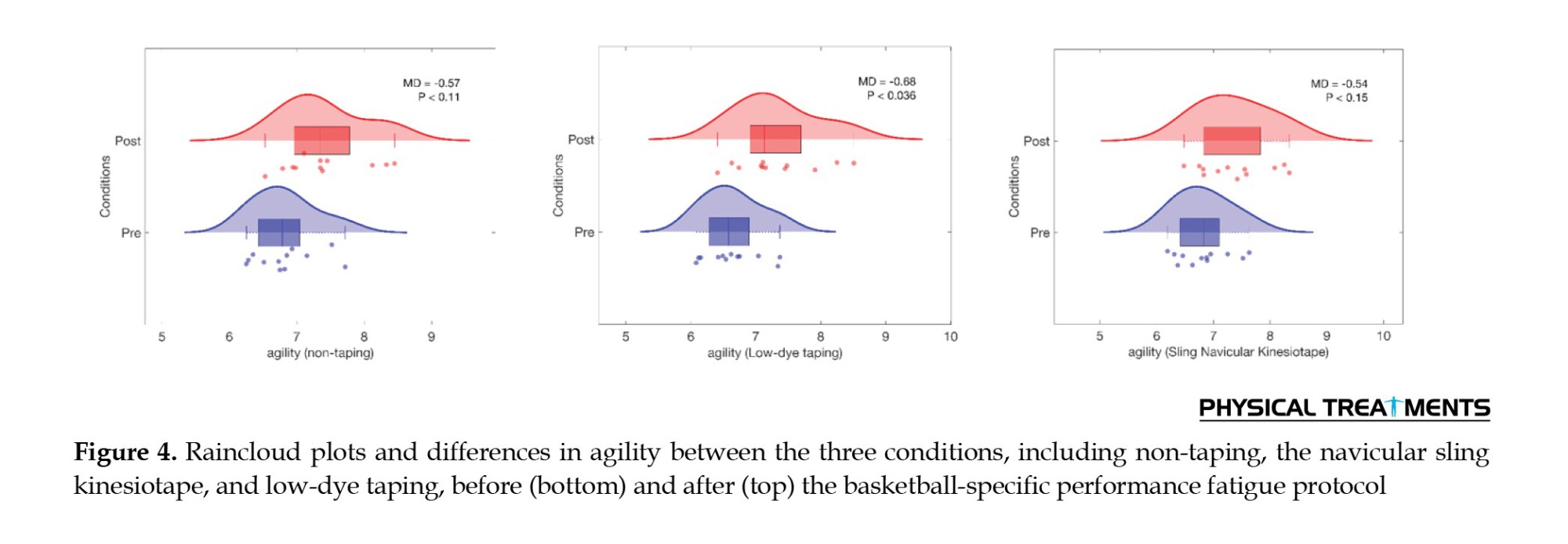 Our findings suggest that athlete performance decreased following the implementation of a basketball-specific performance fatigue protocol, with further enhancements observed after the application of low-dye taping and navicular sling kinesiotape. These interventions mitigated the negative impact of flat feet on performance, aligning with previous research that indicates the positive effects of modifying flat feet with taping techniques [38]. The enhancements in performance factors, which are important components of basketball success, were anticipated with the use of low-dye taping and navicular sling kinesiotape, even after applying the basketball-specific performance fatigue protocol.