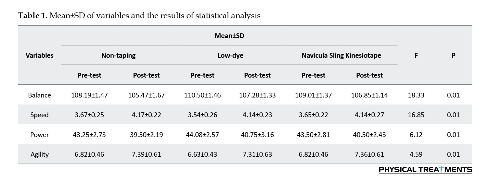 The Kolmogorov-Smirnov test was employed to verify the normal distribution of data, while the Levene’s test was employed to verify the homogeneity of variances. To examine how low-dye taping and navicular sling kinesiotape affect balance, power, speed, and agility under fatigued and non-fatigued conditions, we utilized an ANOVA (Table 1). Tukey’s test was employed to compare sports functions in different conditions and situations. The significance level was set at P<0.05, and the entire statistical analysis was done using SPSS software, version 25.