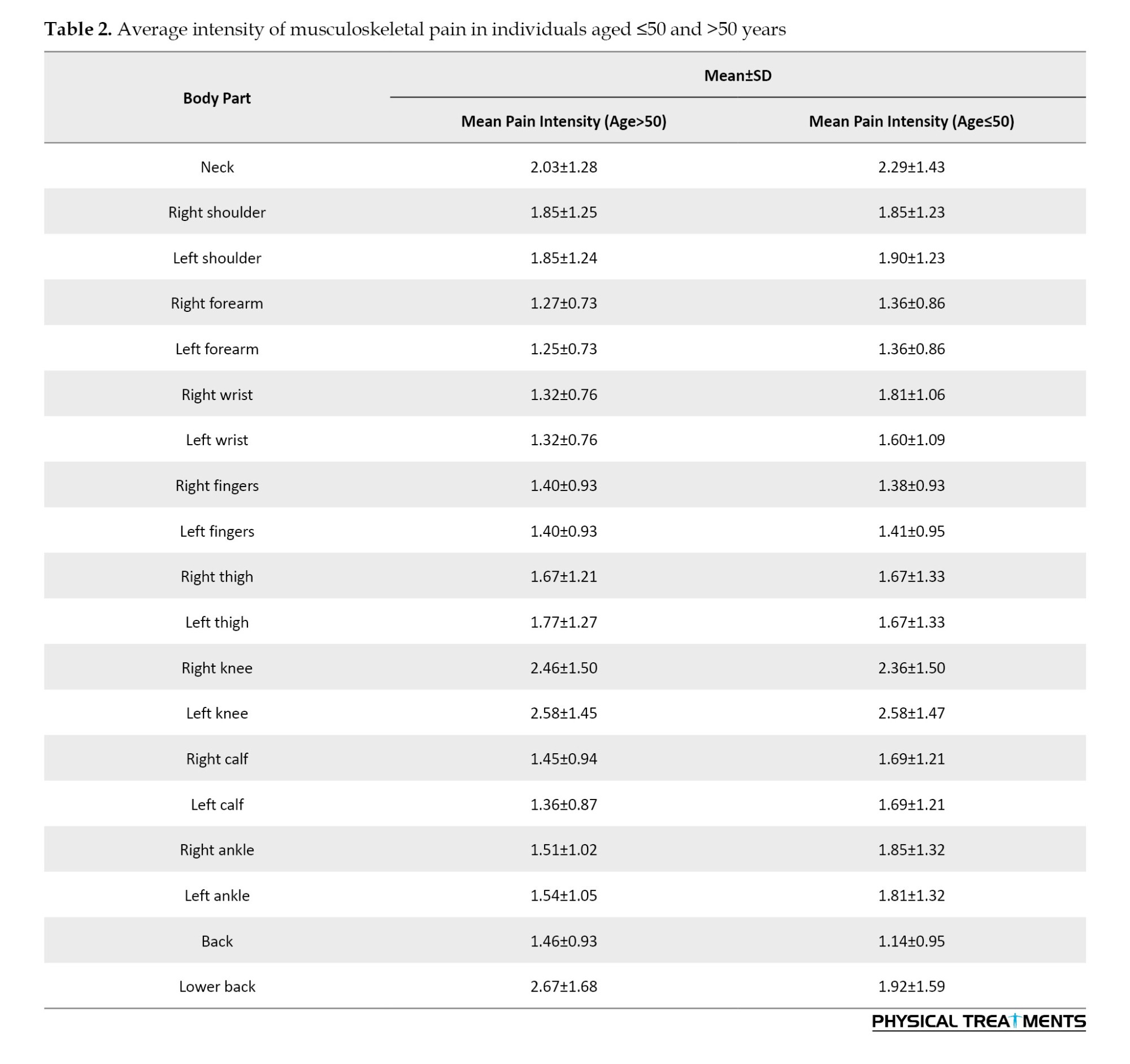 Additionally, the results showed no significant correlation between age and musculoskeletal pain in any body region, as the severity of pain in the knees and lower back was consistent across both groups: Participants aged ≤50 years and those aged >50 years (P>0.05). However, individuals aged ≤50 years reported greater pain severity in the left knee (2.58), right knee (2.36), neck (2.58), and lower back (1.92), while they reported the lowest pain severity in the back (1.14). On the other hand, participants aged >50 years experienced more pronounced pain in the lower back (2.67), left knee (2.58), and right knee (2.46), while they reported less pain in the forearms (1.27) (Table 2).