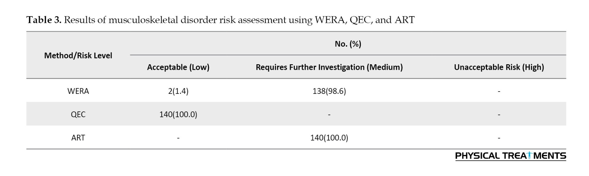 In QEC, posture assessment is limited to the shoulders, wrists, neck, and back. Although factors, such as load handling, vibration, visual demands, and stress, are self-reported by participants in the second questionnaire, this self-reporting has lower reliability compared to evaluations performed by experts. Although QEC can be considered a complete assessment of MSDs, because it examines both physical and psychological factors, the self-report part of this questionnaire can directly affect the final risk assessment [33]. This aspect may be influenced by the individual’s condition, and as a result, the assessment of the risk of MSDs may be misguided.. Therefore, although the QEC method is one of the proposed approaches for evaluating MSDs, as a standalone method, it is not completely accurate or efficient and does not provide a fully reliable report. This assertion was clearly demonstrated in our results, as WERA and ART reported more similar outcomes than QEC.