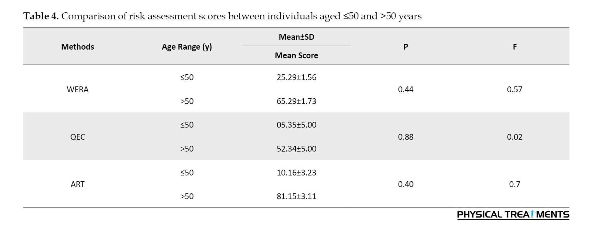 Table 3 shows that both WERA and ART indicated a moderate level of risk in the studied population. In contrast, assessments using the QEC method suggested that the risk of MSDs among drivers fell within the low-risk range. This finding indicates that WERA and ART show a higher level of agreement with each other. According to Table 4, individuals over 50 years old received higher risk scores using WERA and QEC compared to those under 50. On the other hand, the average risk score for individuals over 50 in ART was lower than that of individuals under 50. However, the results of the t-test showed that these differences were not statistically significant (P>0.05).
