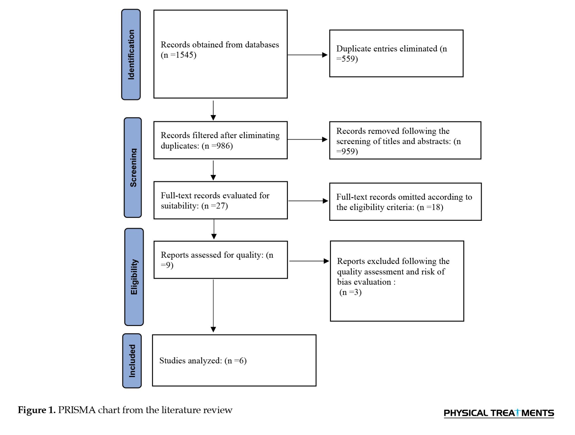 A total of 1545 possible articles were discovered in the initial search using the databases listed in the search strategy. Once duplicates were eliminated, 986 records were left. After screening the title, abstract, and full text, if required, in accordance with the inclusion and exclusion criteria, only 27 articles were deemed acceptable. Nine studies were found to be eligible after applying the CASP checklist. Ultimately, six studies were chosen for examination after receiving moderate to high-quality ratings. A flow chart of PRISMA 10 is displayed in Figure 1.