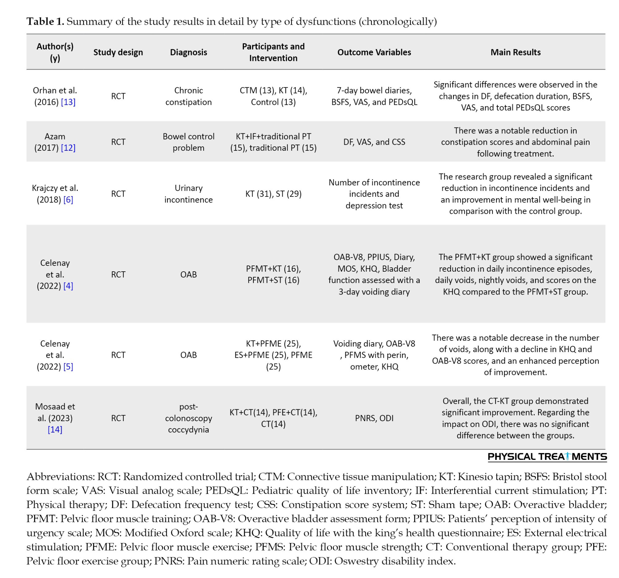 A summary of the relevant articles is presented in Table 1. Of the six studies, urinary system conditions were investigated in three studies 4-6, defecatory conditions were assessed in three studies [12, 13], and coccydynia was assessed in one study [14]. Due to the scattered and inconsistent outcome measures in the studies, it was not possible to calculate the effect size or conduct a meta-analysis.