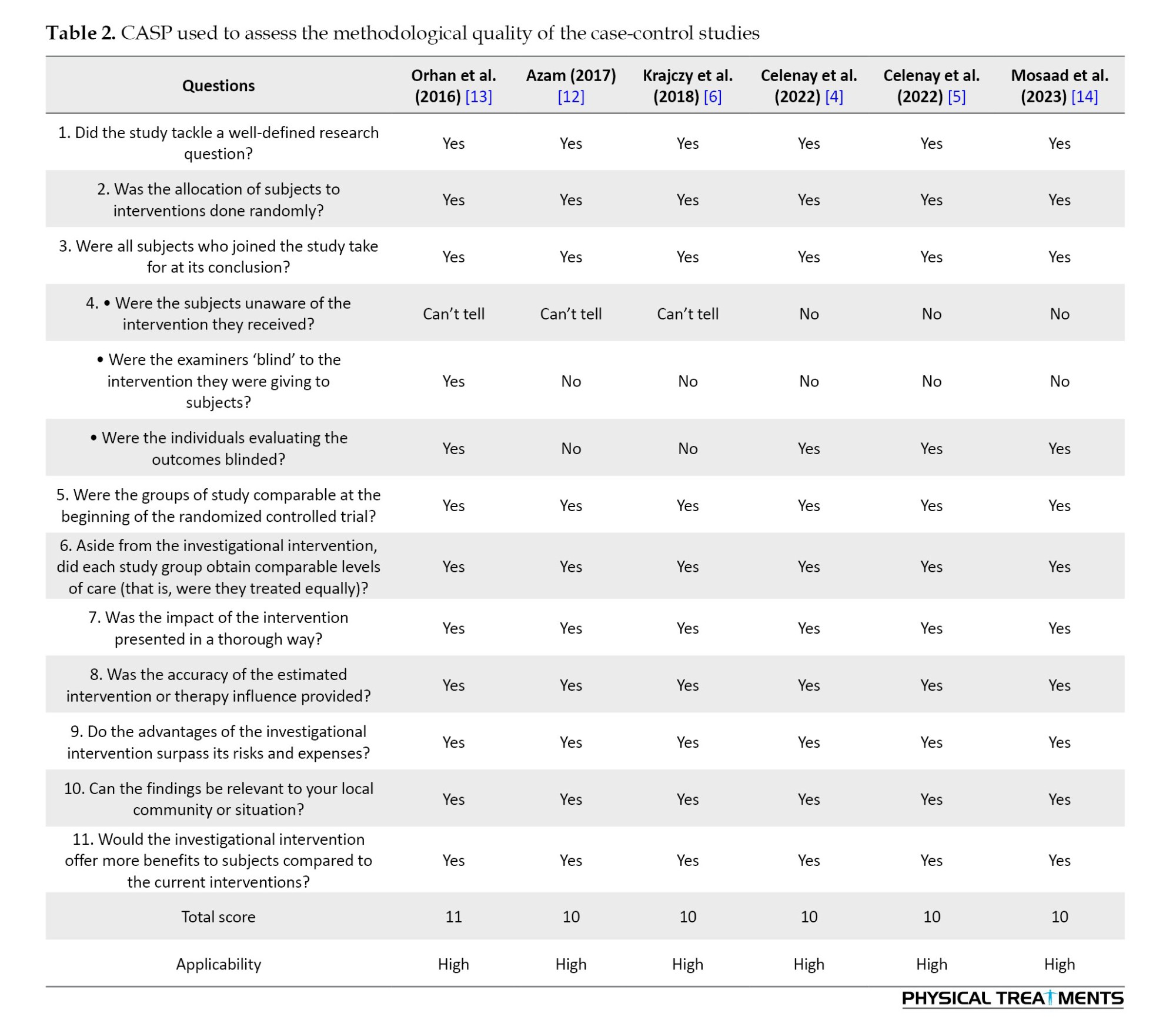 All of the featured articles had an average quality rated as moderate to high. Table 2 provides a summary of the CASP findings. High applicability was demonstrated by the included RTCs.