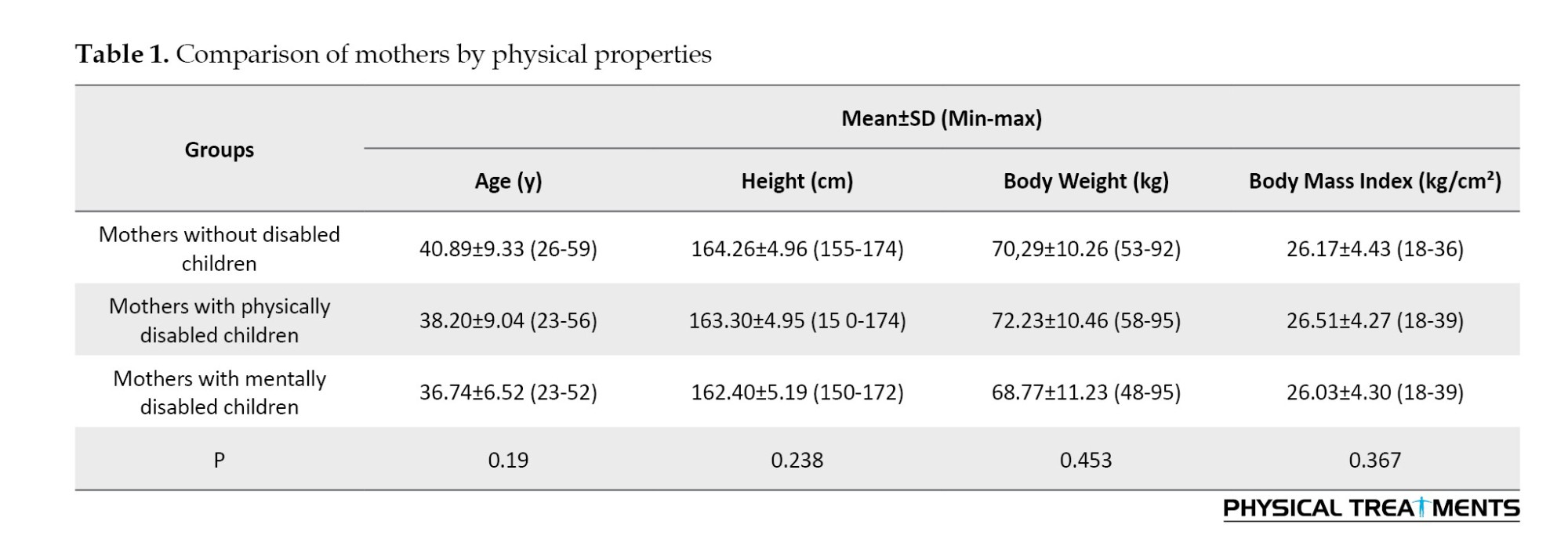 The average age of the mothers participating in the study was 38.61±8.49 years, with the majority (51.4%) falling within the 34-45 age range. When the mothers were grouped according to the disability status of their children, the physical properties were similar (P>0.05) (Table 1).