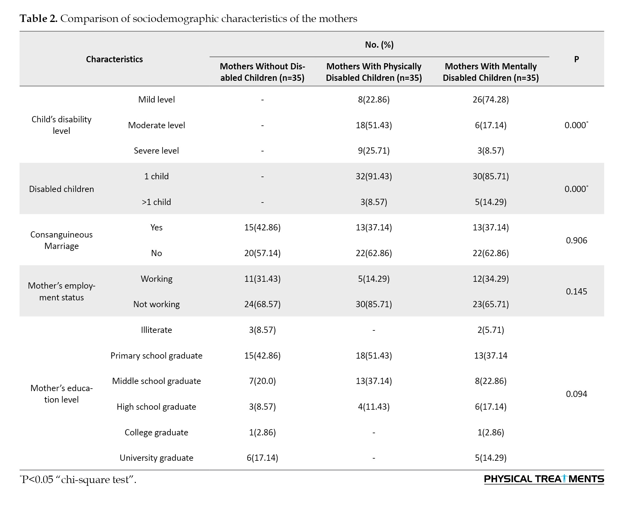 The results revealed that mothers of children with disabilities experienced a greater impact on their psychological well-being compared to those with non-disabled children. However, physical activity levels and functional capacities were comparable between the two groups. Regarding demographic variables, a general resemblance was observed between mothers with and without disabled children. A notable similarity was observed in the educational background, particularly among individuals with lower educational levels, such as those who are illiterate or have completed primary school. This consistency is likely influenced by the fact that all participating mothers resided in the city of Gaziantep. Most participants, both mothers of children with disabilities and those without, were primary school graduates.