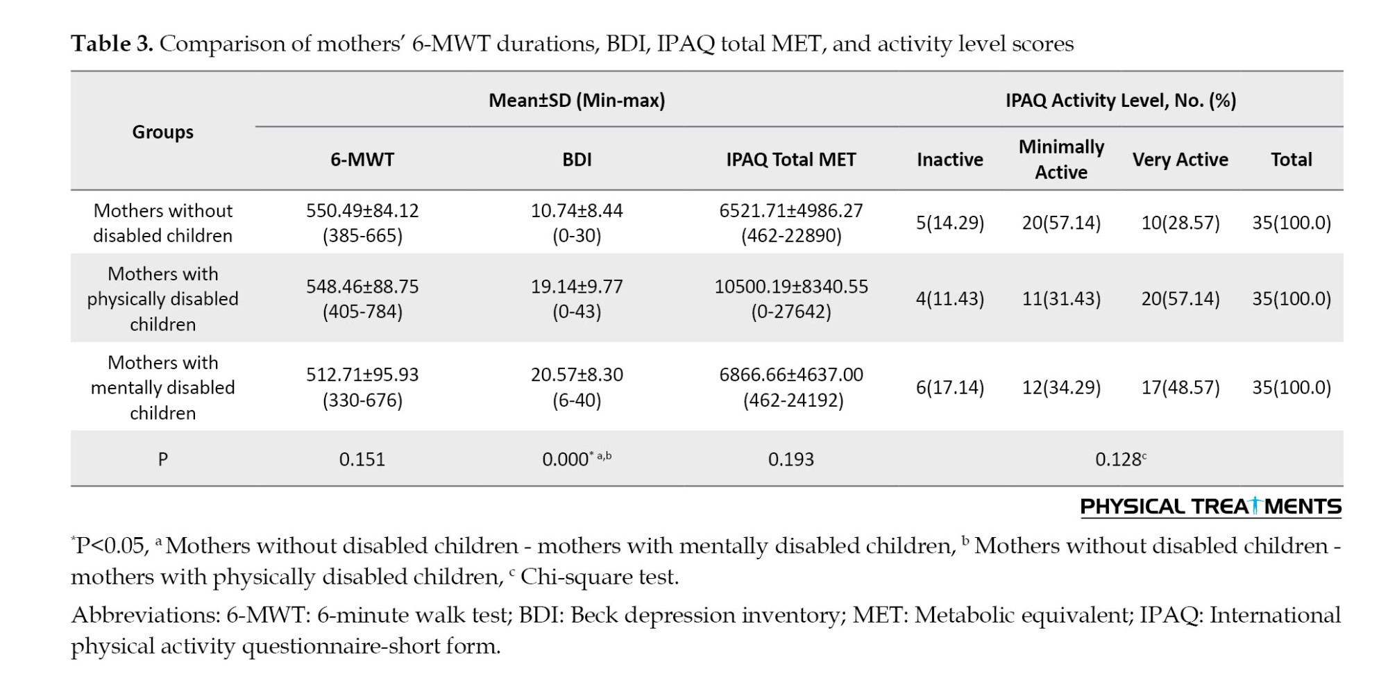 Table 3 presents a comparison of total MET values from the IPAQ questionnaire, total distances recorded during the 6-MWT, and BDI scores among mothers of children with intellectual disabilities, physical disabilities, and those with non-disabled children. No statistically significant differences were observed among the three groups in terms of total MET scores from the IPAQ and total walking distances measured in the 6-MWT (P>0.05). However, a significant difference was detected in BDI scores between the groups (P<0.05). Mothers of non-disabled children exhibited significantly lower BDI scores compared to mothers of children with intellectual disabilities (P<0.05). Furthermore, the BDI scores of mothers of children with both intellectual and physical disabilities showed no significant difference (P>0.05) (Table 3).