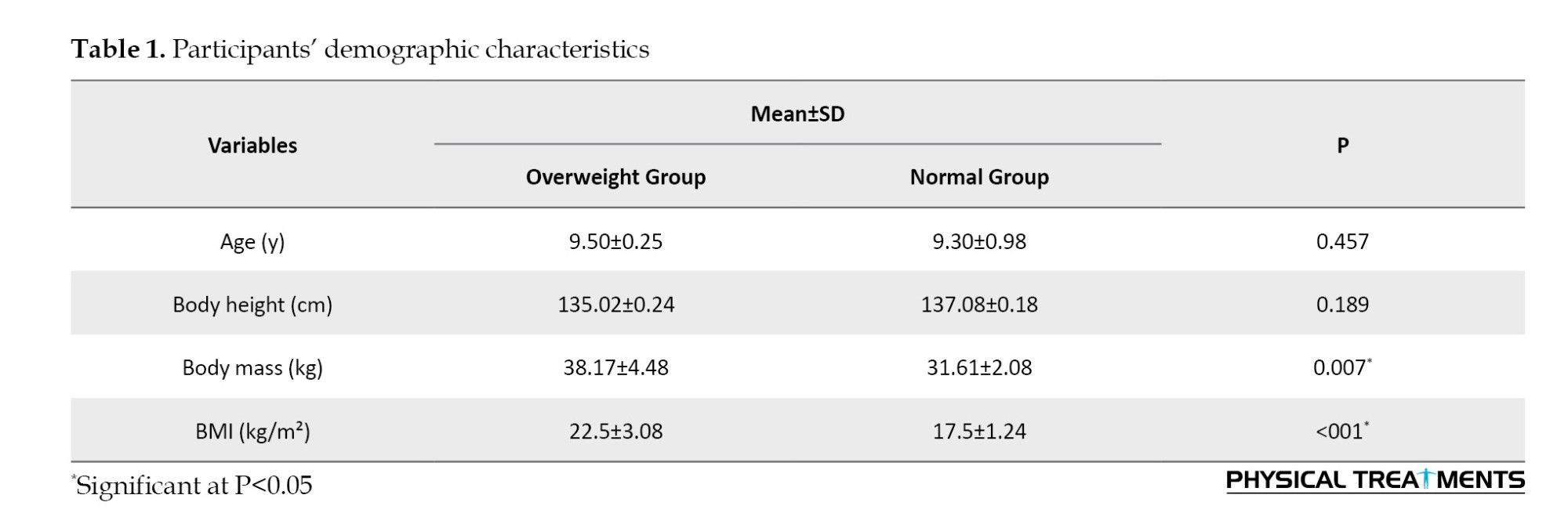 Descriptive characteristics of the participants are presented in Table 1. A comparison of baseline characteristics between the overweight and normal-weight groups revealed no significant differences for most variables, including height (P=0.457), active jump height (P=0.112), Illinois agility test performance (P=0.189), and sit-and-reach flexibility (P=0.231). However, as expected, significant differences were observed in body mass (P<0.001) and BMI (P<0.001), reflecting the classification criteria for the two groups.