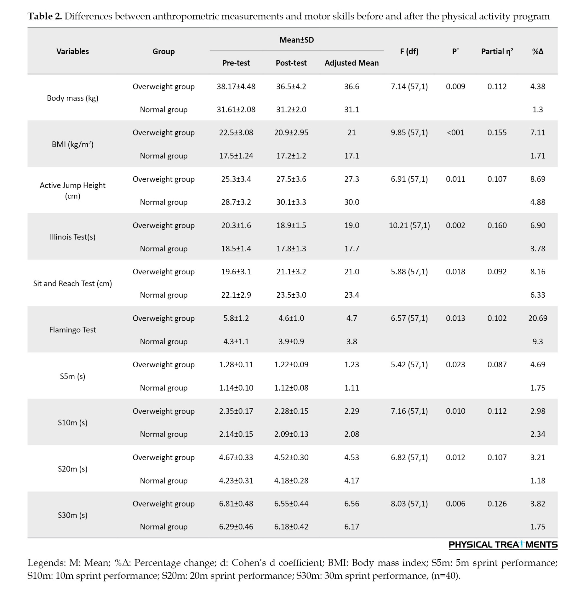 The overweight group showed a significant reduction in body mass (F=7.14, P=0.009, %Δ=4.38%) and BMI (F=9.85, P< 0.001, %Δ=3.3%), while the normal group had a smaller but still notable decrease in both measures. Active jump height improved significantly in both groups (F=6.91, P=0.011), with the overweight group showing a %Δ of 7.11% and the normal group improving by 3.89%. The Illinois test demonstrated significant improvements for both groups (F=5.47, P= 0.024), with the overweight group showing a %Δ of 5.29% and the normal group a %Δ of 3.67%. Flexibility, as measured by the sit-and-reach test, increased notably in the overweight group (F=6.81, P=0.013, %Δ=16.61%) and slightly in the normal group (%Δ=10.37%). Balance, assessed using the Flamingo test, improved significantly in the overweight group (F=4.63, P=0.038, %Δ=20.69%) and to a lesser extent in the normal group (%Δ=12.79%). Sprint performance across all distances (5m, 10m, 20m, and 30m) improved significantly in the overweight group (P<0.05 for all), with %Δ ranging from 2.98% to 8.32%, whereas the normal group also improved but with smaller percentage changes (1.17% to 3.11%).