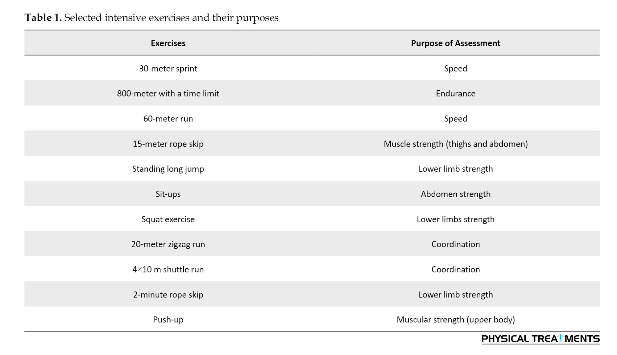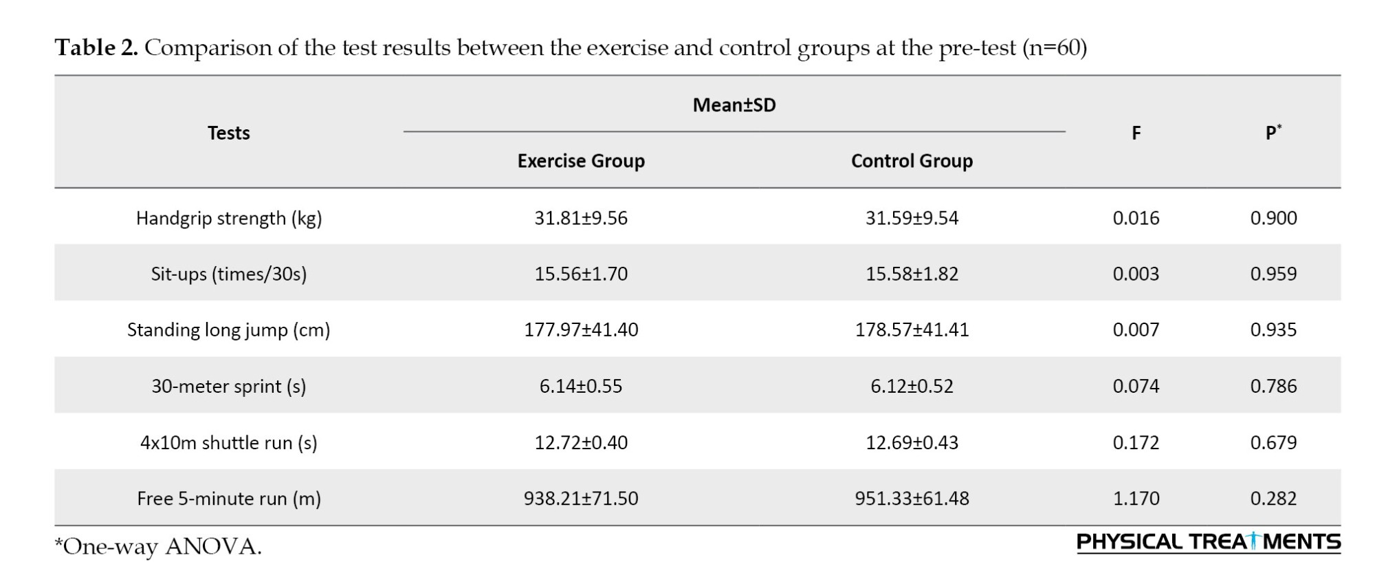 Prior to implementing the selected intensive physical exercise program, participants underwent a pre-test assessment using six physical fitness tests to determine any pre-existing differences between the groups.