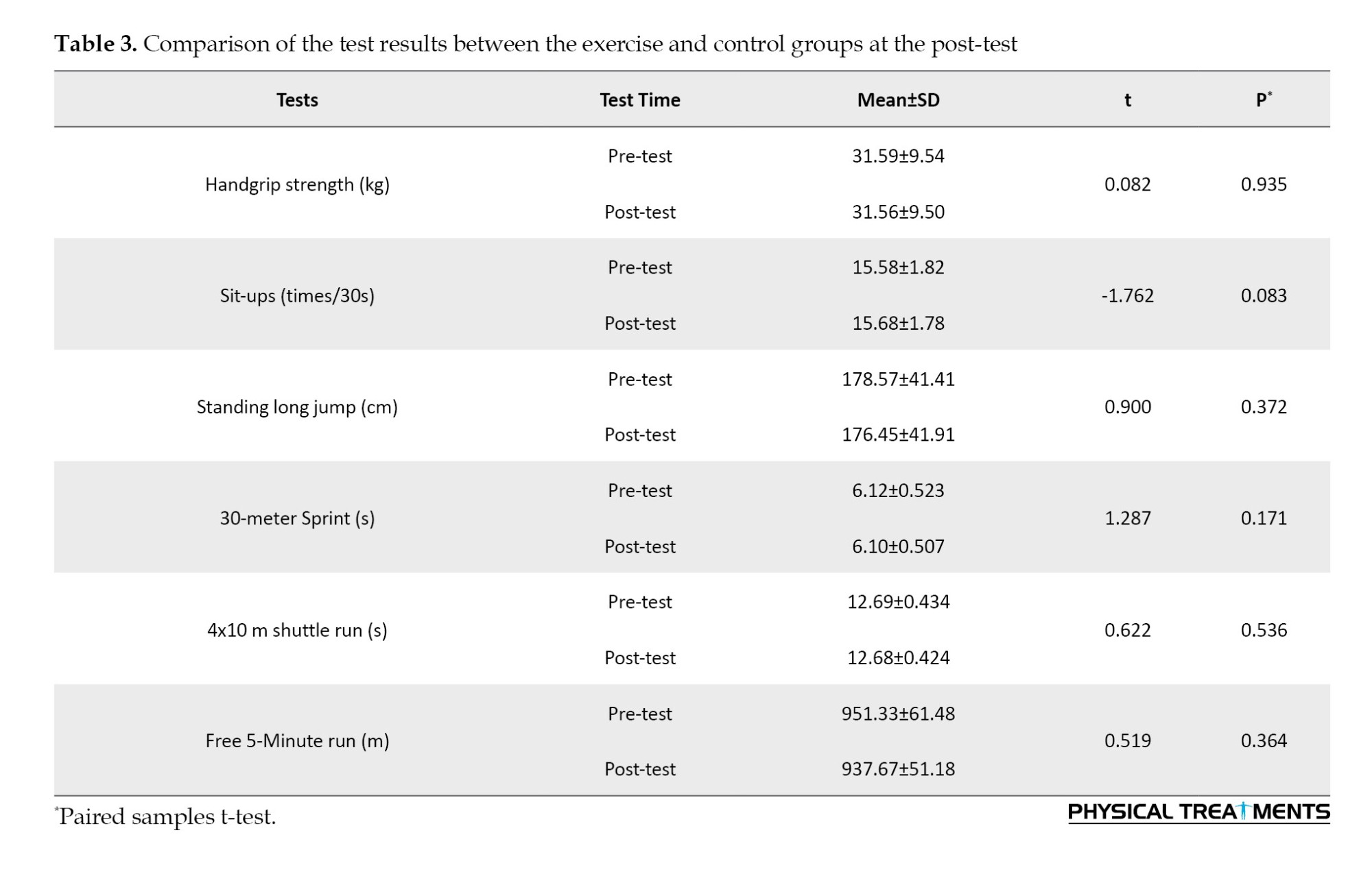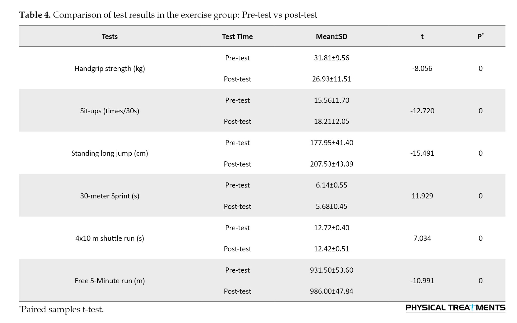 The result demonstrated significant improvements in six physical tests after a 12-week training program using selected intensive exercises in the experimental group (Table 4). Specifically, the scores of the tests, including handgrip (t=-8.056, P=0.000), sit-ups (t=-12.720, P=0.000), standing long jump (t=-15.491, P=0.000), 30-meter sprint (t=11.929, P=0.000), 4×10-meter shuttle run (t=7.034, P=0.000), and free 5-minute run (t=-10.991, P=0.000) showed significant differences between pre-test and post-test. These results collectively indicate significant improvements in lower and upper extremity strength, abdominal strength, speed, body control, and endurance within the group over the testing period (P≤0.05).