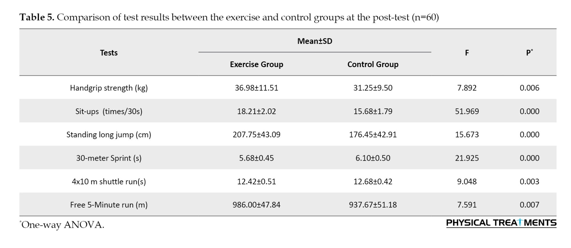 ANOVA results revealed significant between-group differences in six physical fitness tests (Table 5): Handgrip strength (F=7.891, P=0.006), sit-ups (F=51.969, P<0.001), standing long jump (F=15.673, P=0.006), 30-meter sprint (F=21.925, P=0.006), 4×10-meter shuttle run (F=9.048, P=0.003), and the 5-minute run (F=7.591, P=0.007). These findings indicate that after 12 weeks of training, the exercise group demonstrated significantly improved lower and upper extremity strength, abdominal strength, speed, body control, and endurance compared to the control group (P<0.05).
